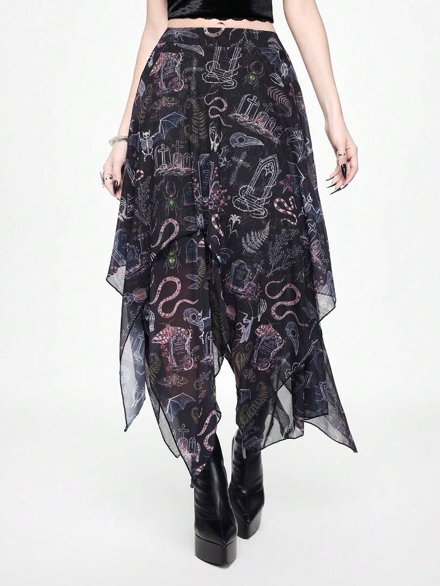 Spring/SummervacationflowerDark Forest Gothic Thorns Cross Vine Snake Skin Print Asymmetrical Hem Double Layer Skirt