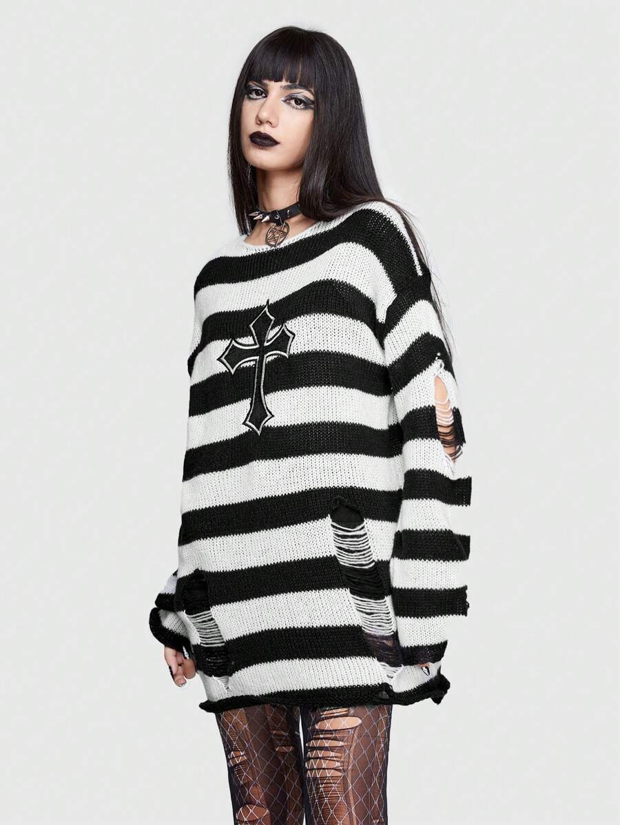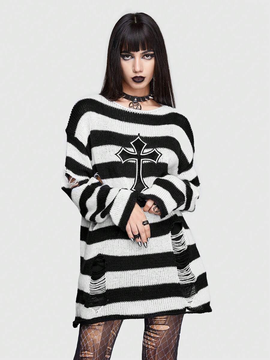 Goth Striped Pattern Cross Embroidery Drop Shoulder Ripped Sweater, School