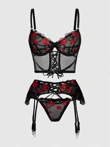 Goth Underwire Strap Lingerie Garter Belt Thong Rose Sexy Lingerie Set 3 Pieces