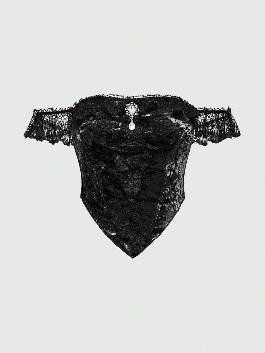 Goth Valentine's Day Off Shoulder Crystal Velvet Sexy Palace Luxurious Lace Splice Cross Pendant Asymmetrical Hem Strapless Blouse For Women