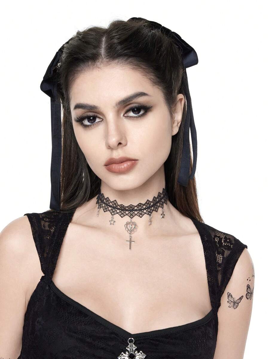 Goth Vintage Dark Lace Cross & Pentagram Choker Necklace