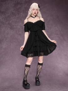 Goth Vintage Lolita Bowknot Decor Puff Sleeve Contrast Lace Form-Fitting A-Line Off-Shoulder Mini Dress
