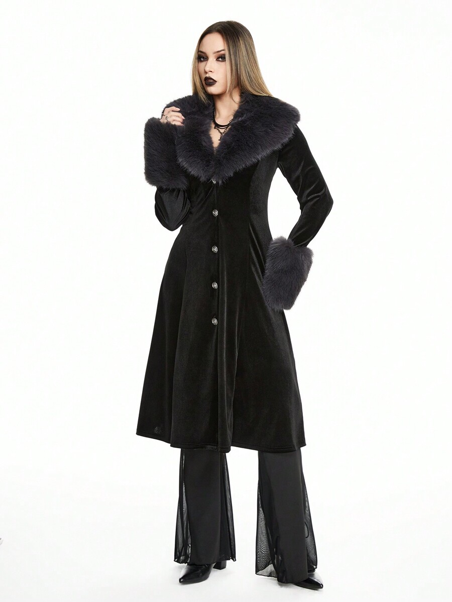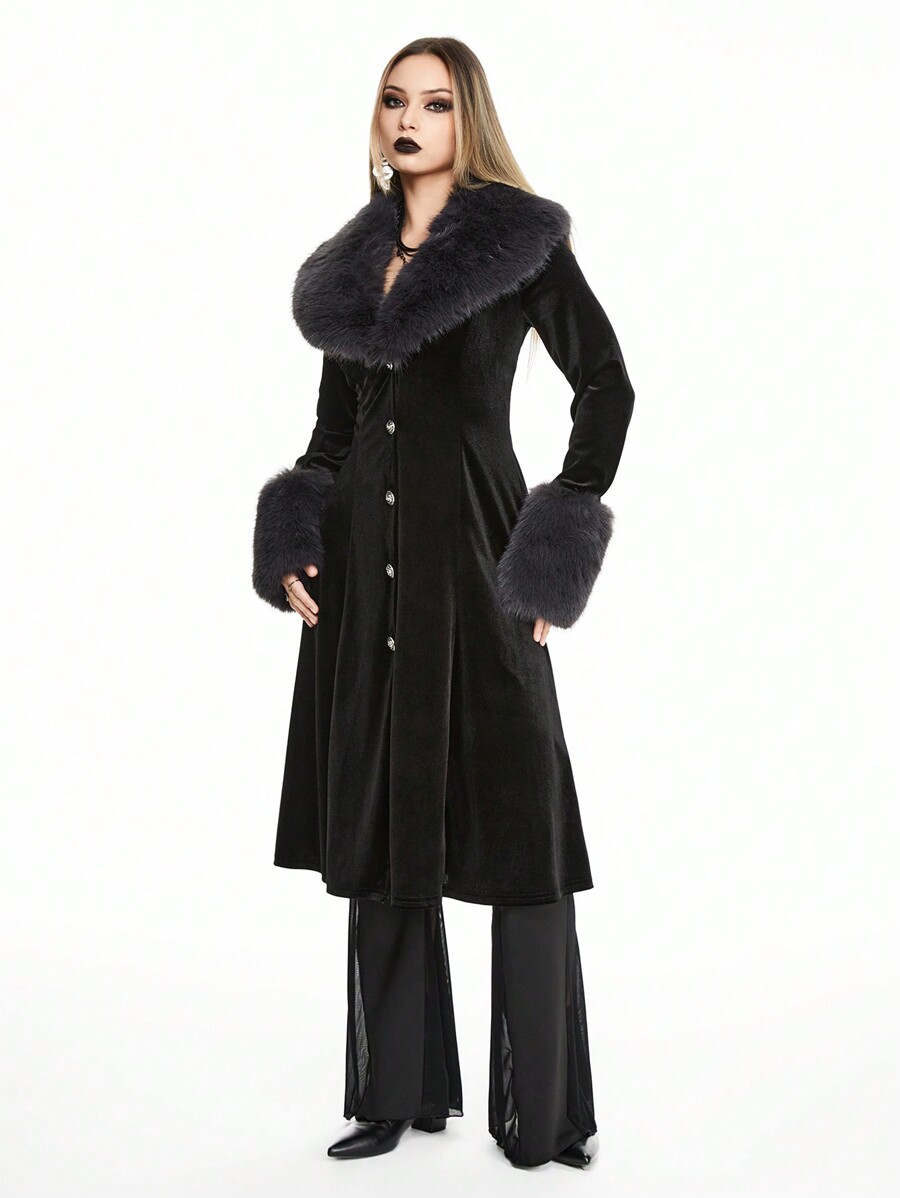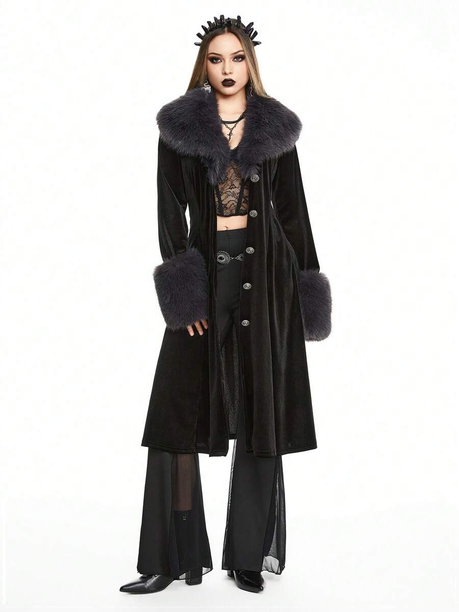 Goth Vintage Palace Style Velvet & Faux Fur Splice Open Front Ladies Trench Coat, Fit For New Year, Valentine's Day, Holiday