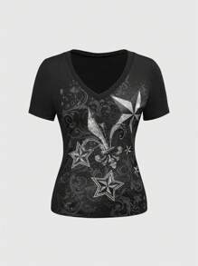 Goth Vintage Star & Iris Flower Print V-Neck Bodycon T-Shirt For Women, Summer