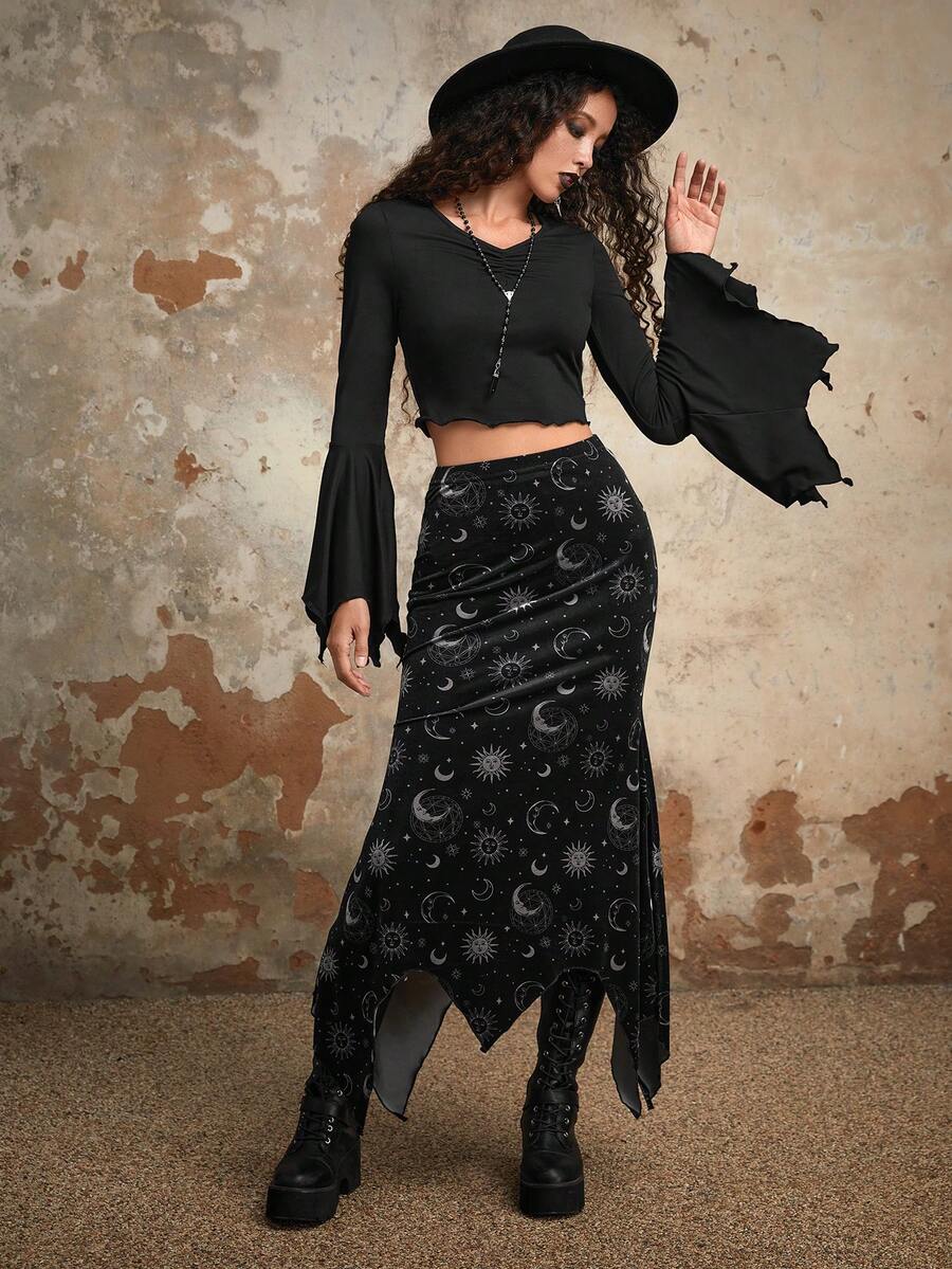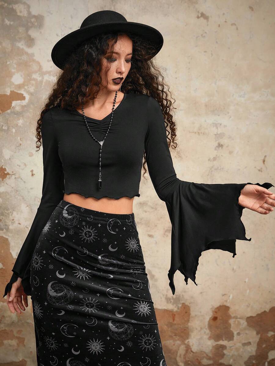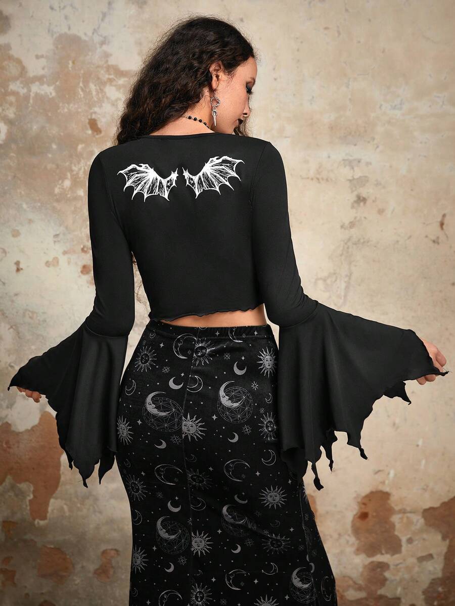 Goth Wings Print Bell Sleeve Tee