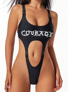 Goth Women Punk Print Cut-Out Plunge Design Spaghetti Strap Sexy One-Piece Swimsuit Summer