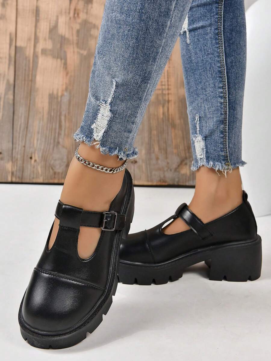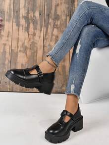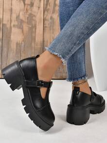 Goth Women's 2023 New Round Toe Black College Style T-Strap Wedge & Thick Sole Shoes