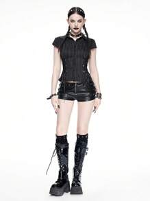 Goth Women's Black Striped Button-Up Shirt With Punk Y2K Skeleton Rhinestone Details, Long Sleeve, Bodycon