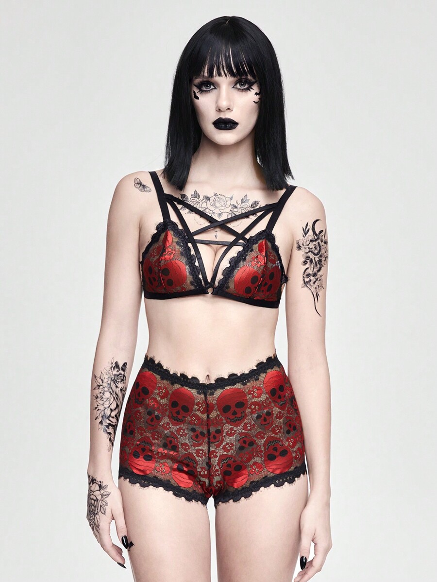 Women's Dark Gothic Halloween Skeleton Lace Pentagram Criss-Cross Straps Wireless Bra And Sexy Panties Lingerie Set