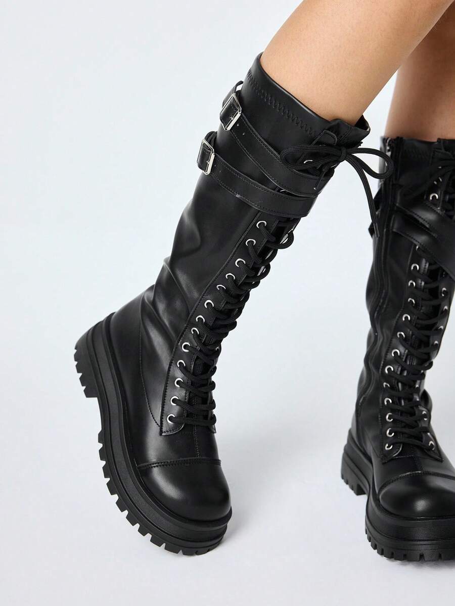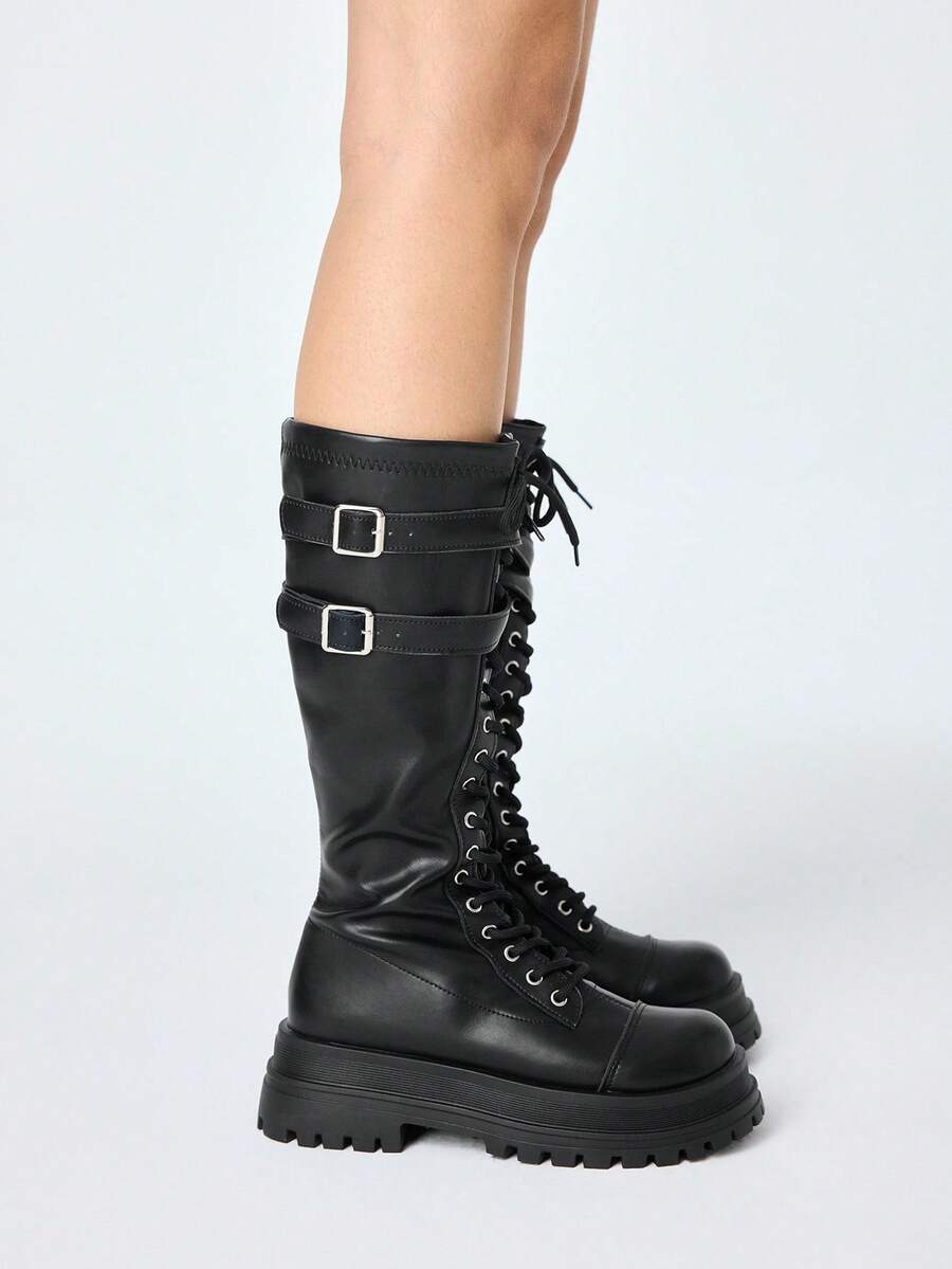 Goth Women's Knee-High Boots Fashionable Lace-Up Thick-Soled Chunky Heel Women's Boots