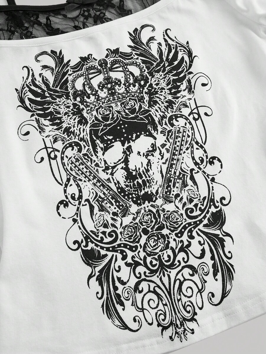 Goth Women's Punk Skull & Gun Rose Print Studded Lace Patchwork 2 In 1 T-Shirt