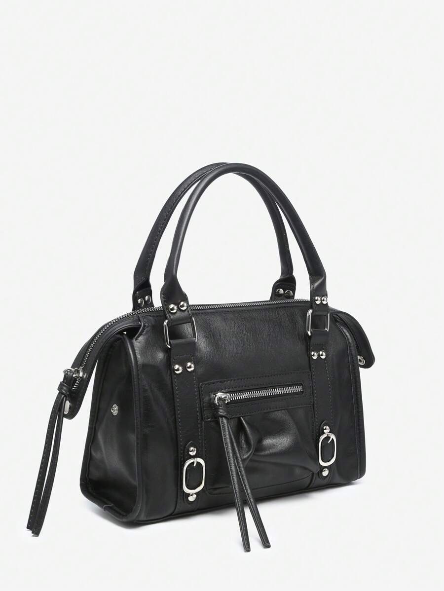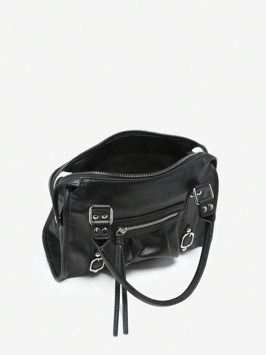 Goth Women's Retro Rivets Multi-Pocket Zipper Closure Pearl Cross Heart Decor Square Handbag, Suitable For Going Out And Dating, Shoulder/Crossbody Bag