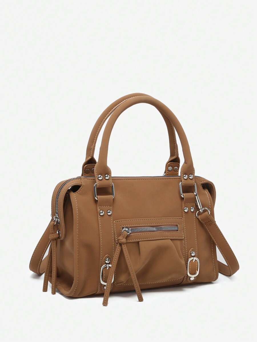 Goth Women's Vintage Riveted Multi-Pocket Zipper Pearl Cross Heart Decor Square Handbag With Detachable Shoulder Strap, Suitable For Going Out And Dating