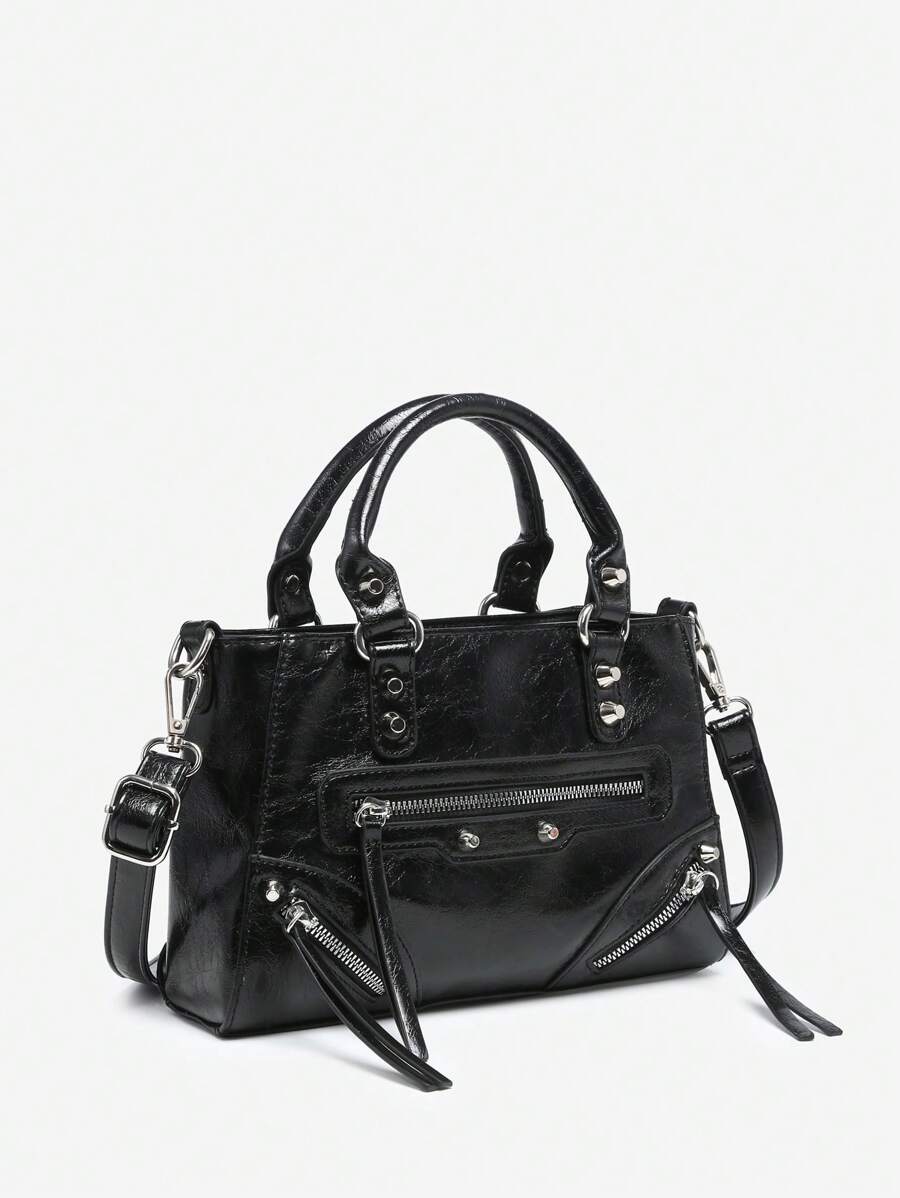 Goth Women's Vintage Rivets Multi-Pocket Zipper Pearl Cross & Heart Decor Square Handbag With Shoulder Strap, Suitable For Going Out & Dates