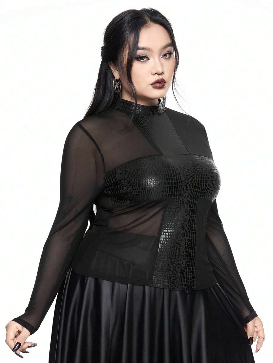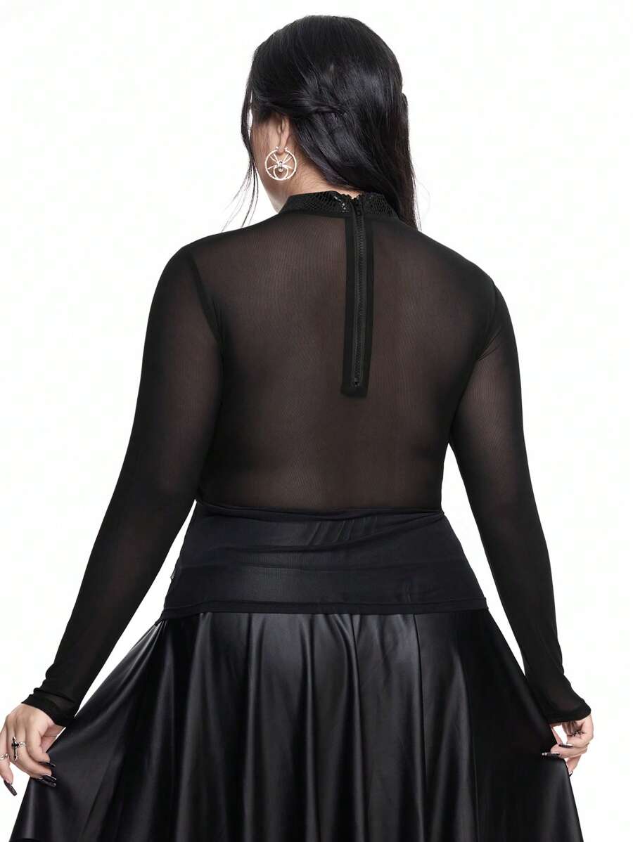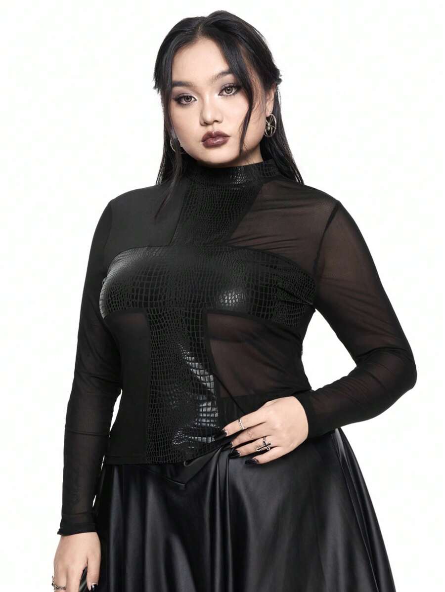 Goth Y2K Sexy Bombshell Solid Color Versatile Cross Patch Mesh Sheer Plus Size Undershirt