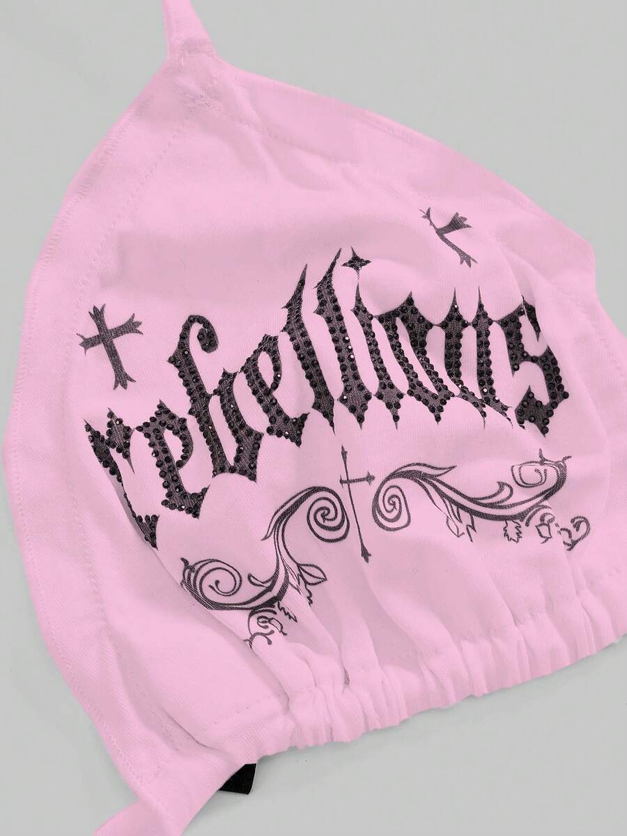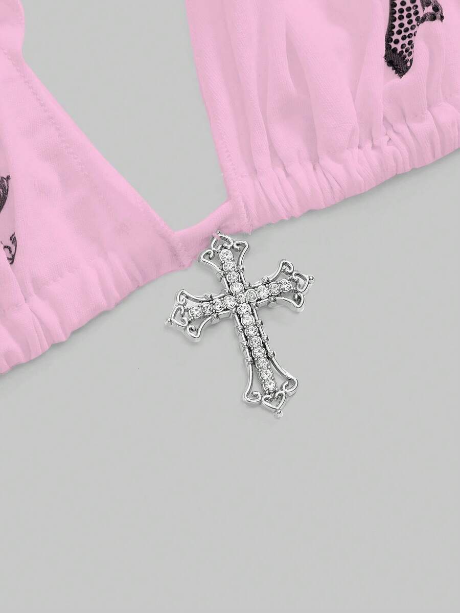 Y2K Sexy Gothic Cross Print Rhinestone Decor Halter Neck Bikini Top