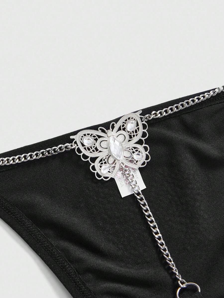 Gothic Butterfly Rhinestones Beaded Chain Milk Silk Thong Panties