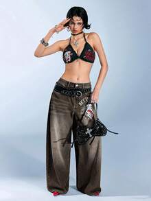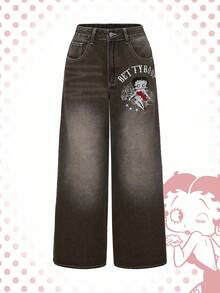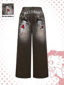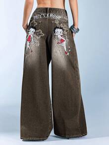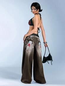Betty Boop | ROMWE Gothic Cross Embroidered Distressed Wash Oversized Wide Leg Extra Long Y2K Jeans