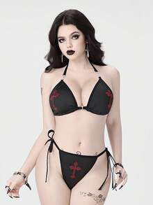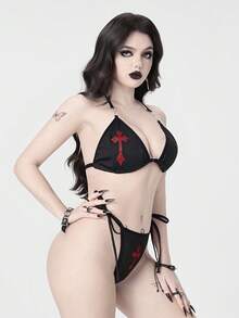 Gothic Cross Rhinestone Embellished Bralette & Thong Lingerie Set