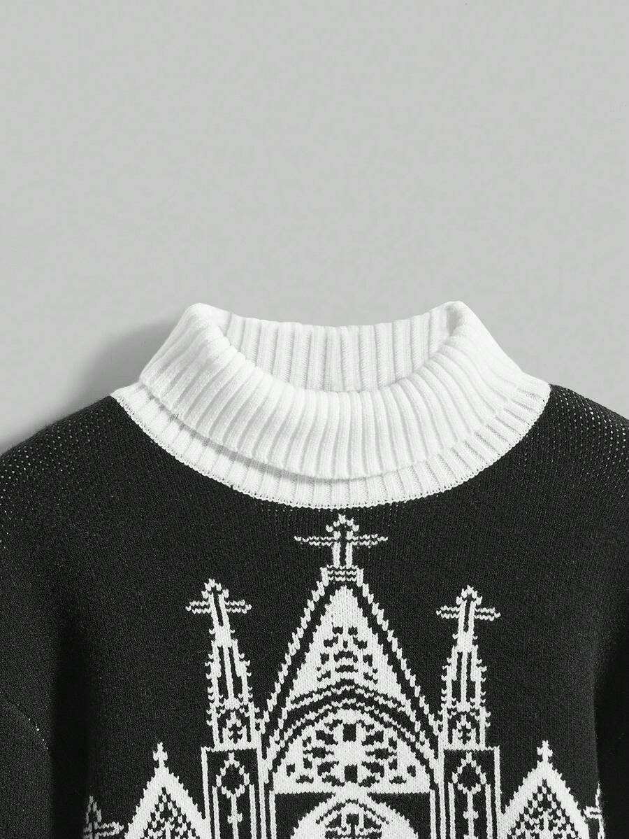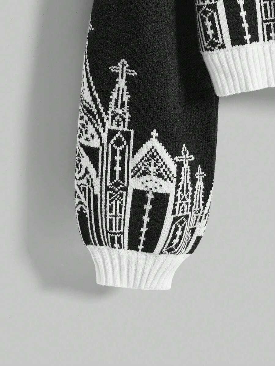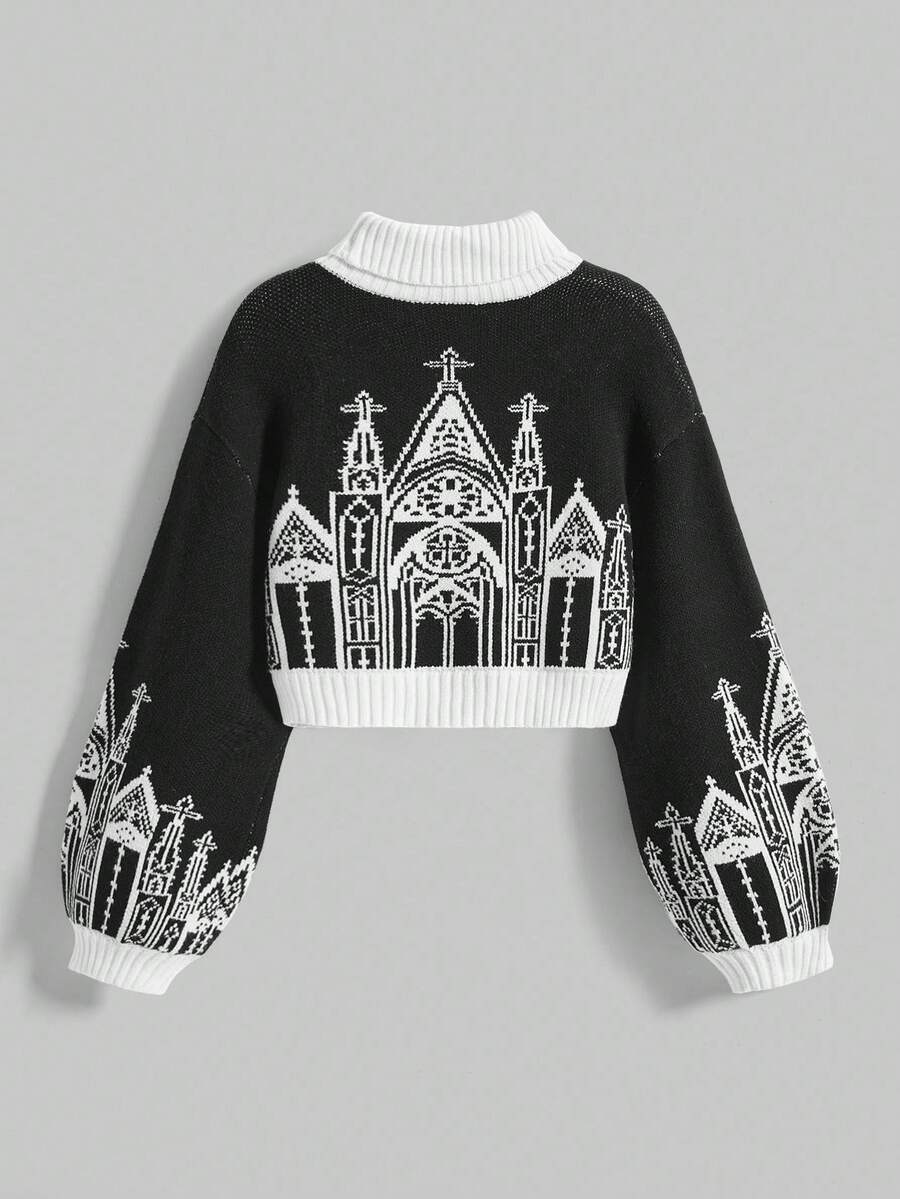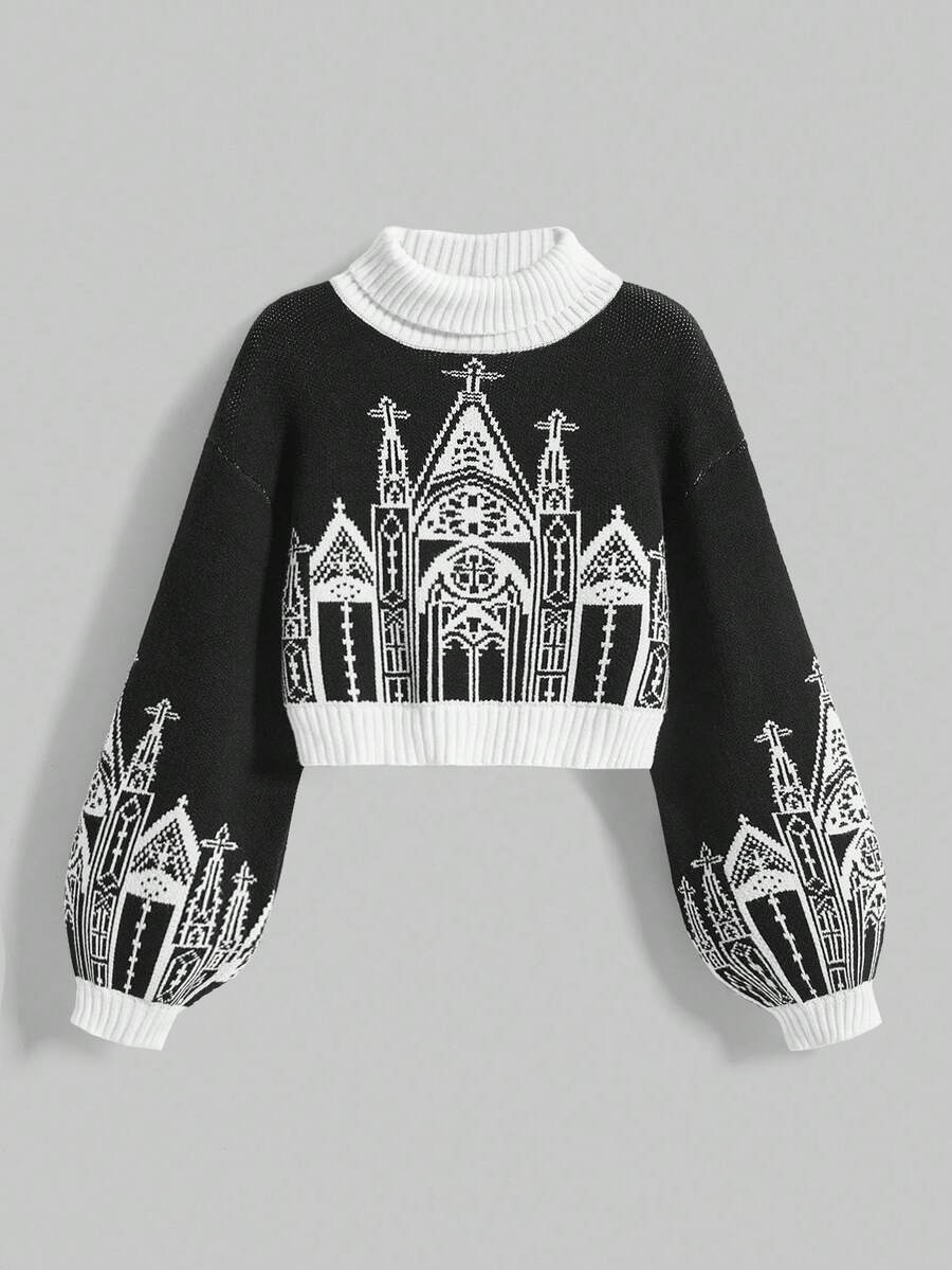 Gothic Dark Halloween High Neck Castle Cross Lantern Sleeve Women Sweater