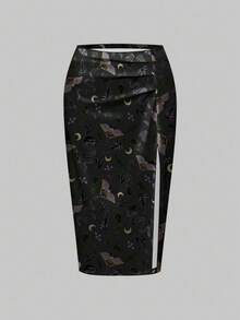 Goth Gothic Dark Mysterious Mori Style Plant, Moth, Snake, Moon, Star, Leaf Print High Slit Plus Size Women Skirt
