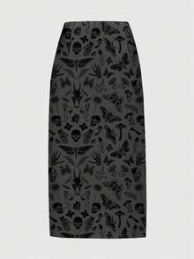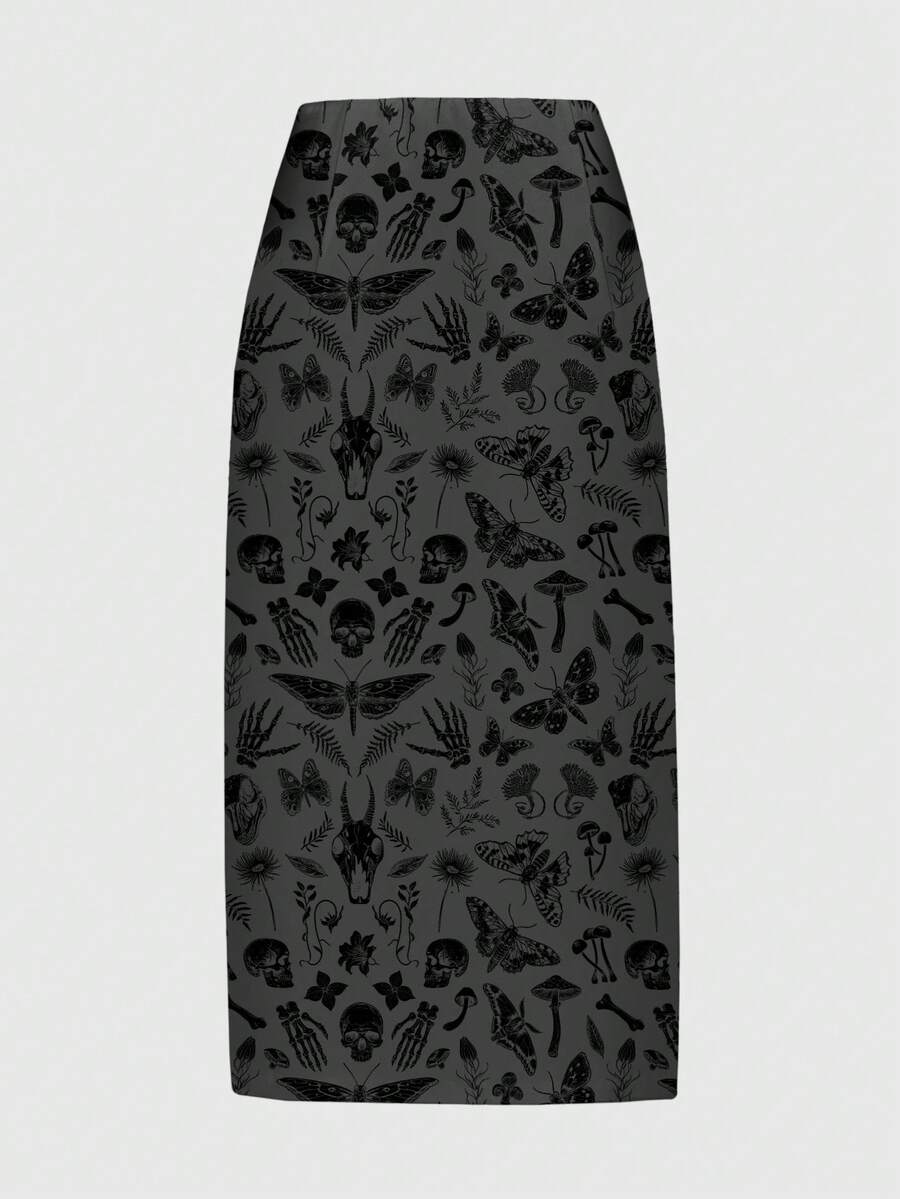 Gothic Dark Mysterious Skull, Butterfly & Leaf Print High Slit Sexy Women Skirt