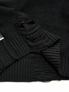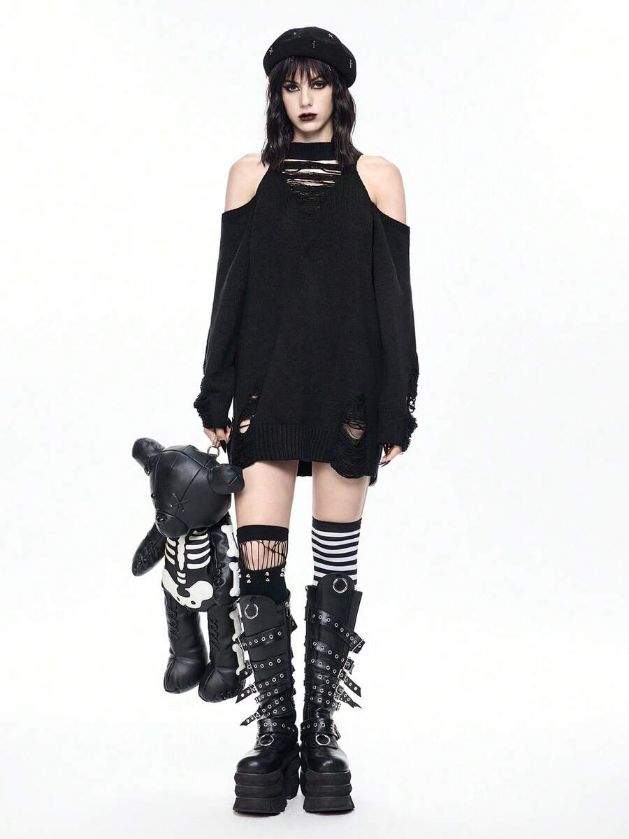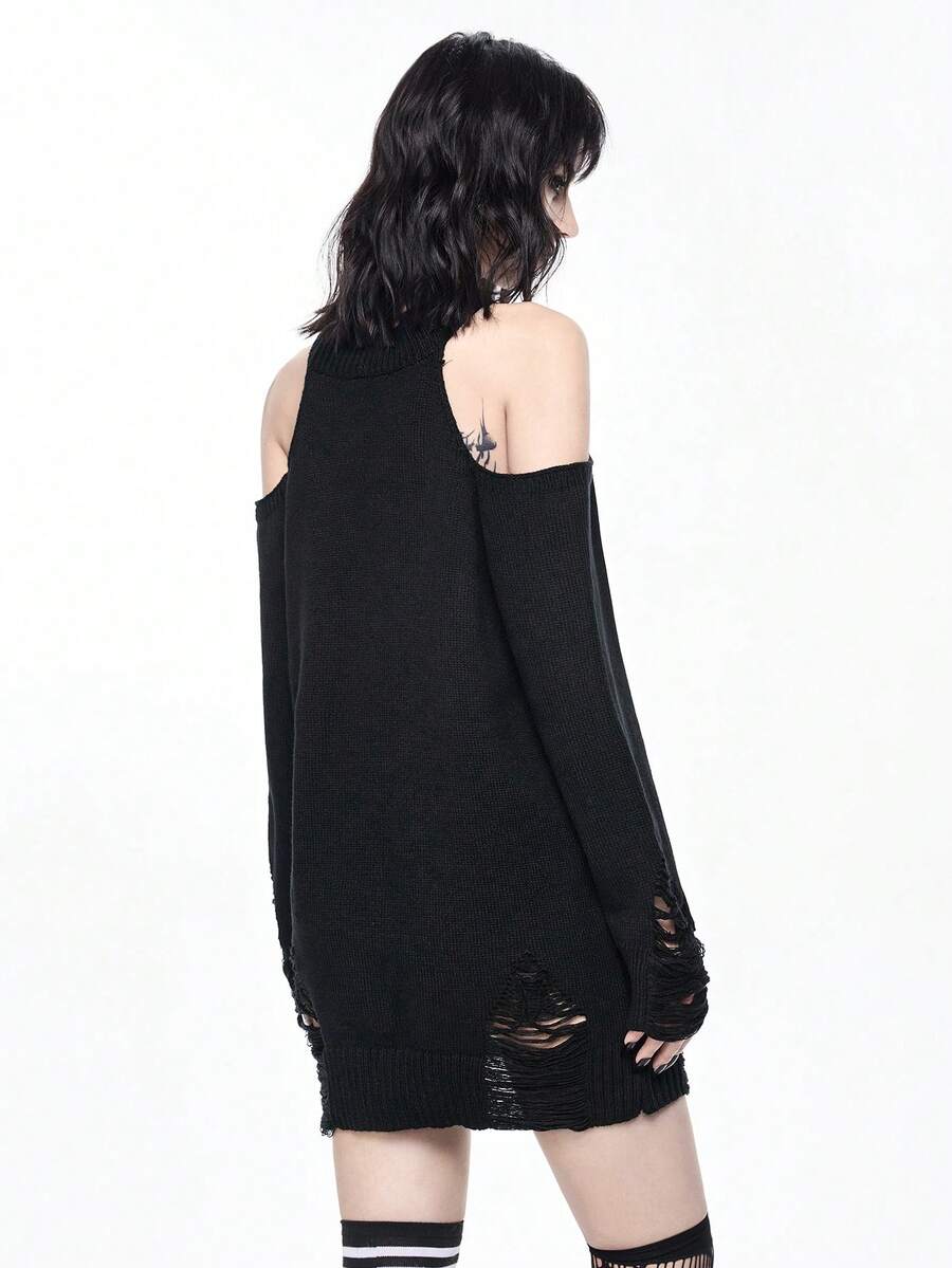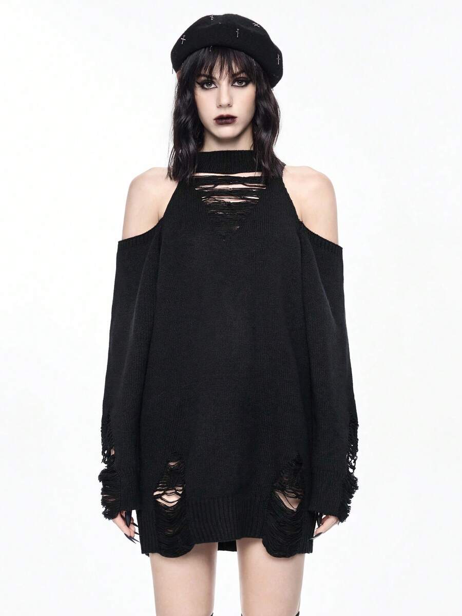 Gothic Dark Style Open Shoulder Halter Neck Ripped Midi Dress, Edgy Distressed Design
