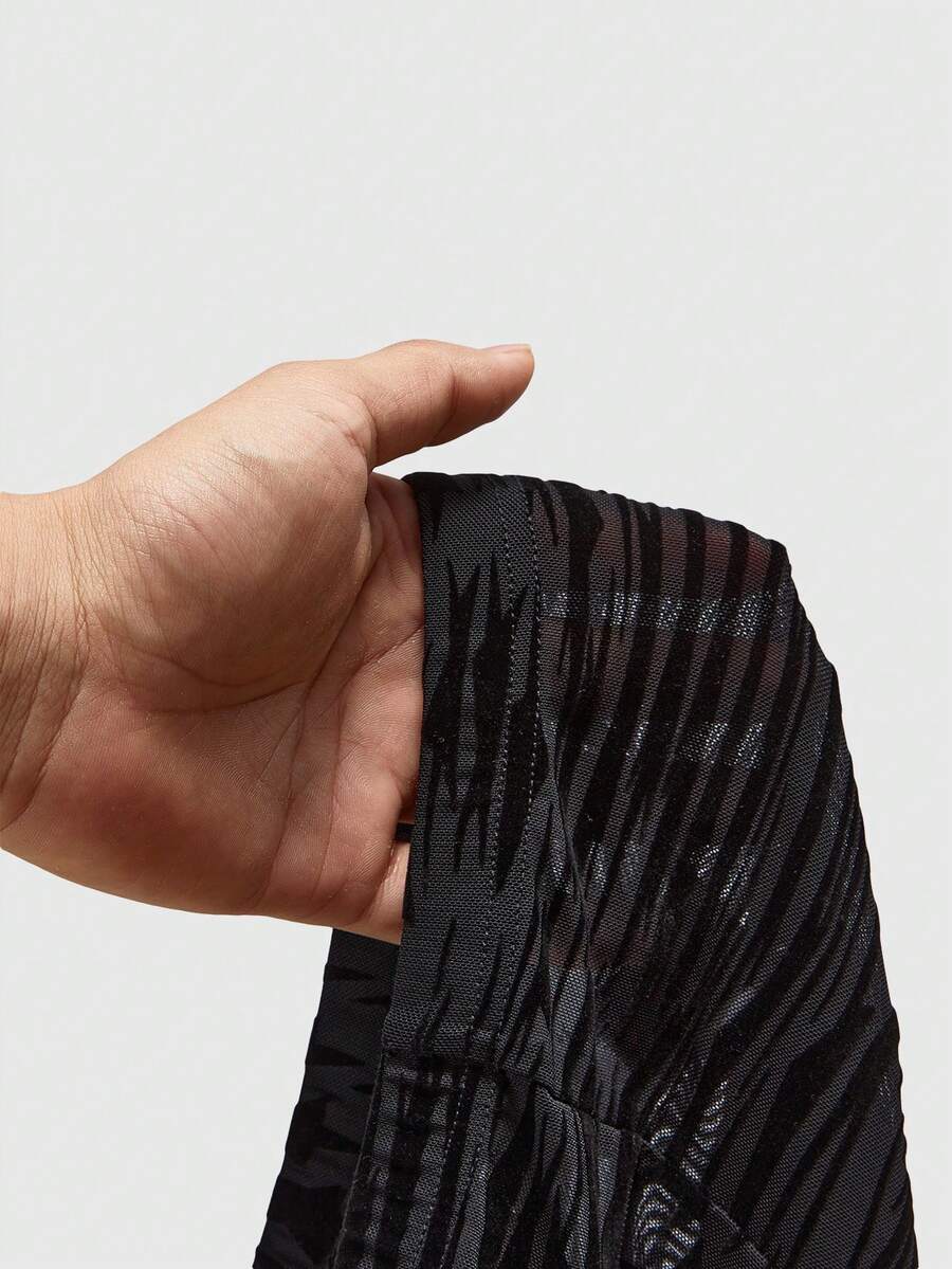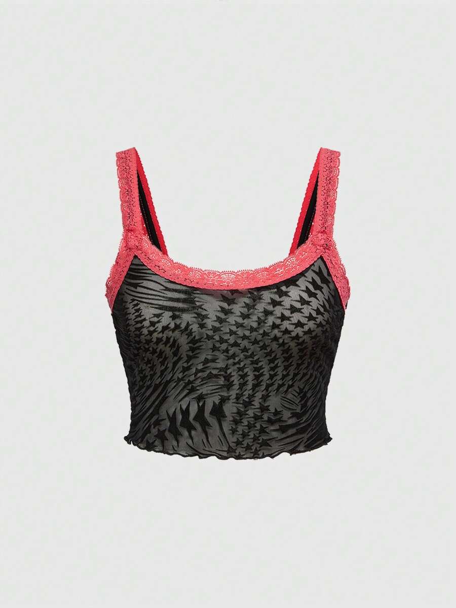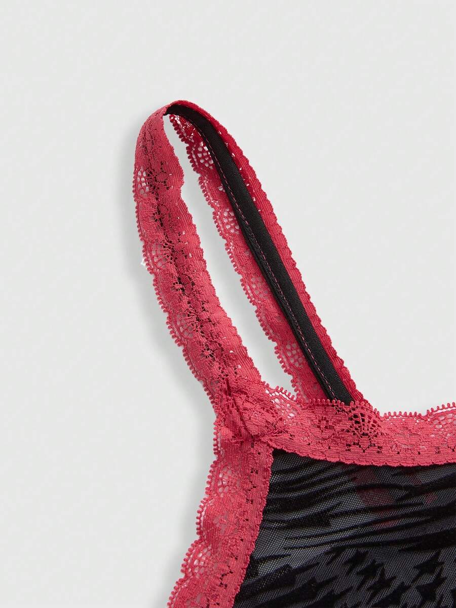 Gothic Lace Bottom Tiger Stripes Contrast Lace Cami & Shorts Lingerie Set, Tight & Sheer