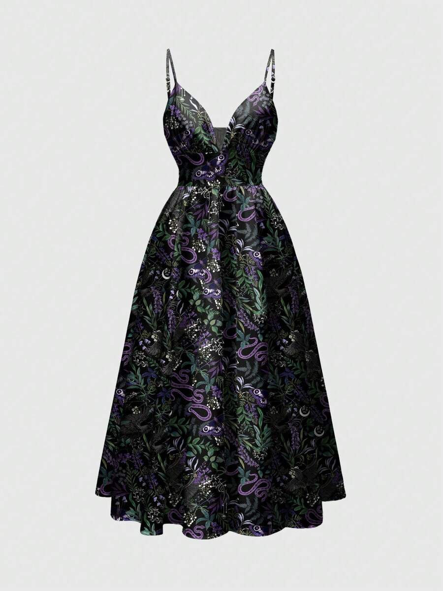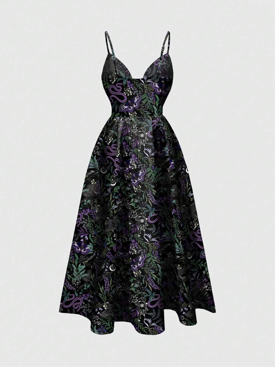 Gothic Mysterious Snake & Celestial Print Romantic Spaghetti Strap Sexy Low-Cut Dress For Women