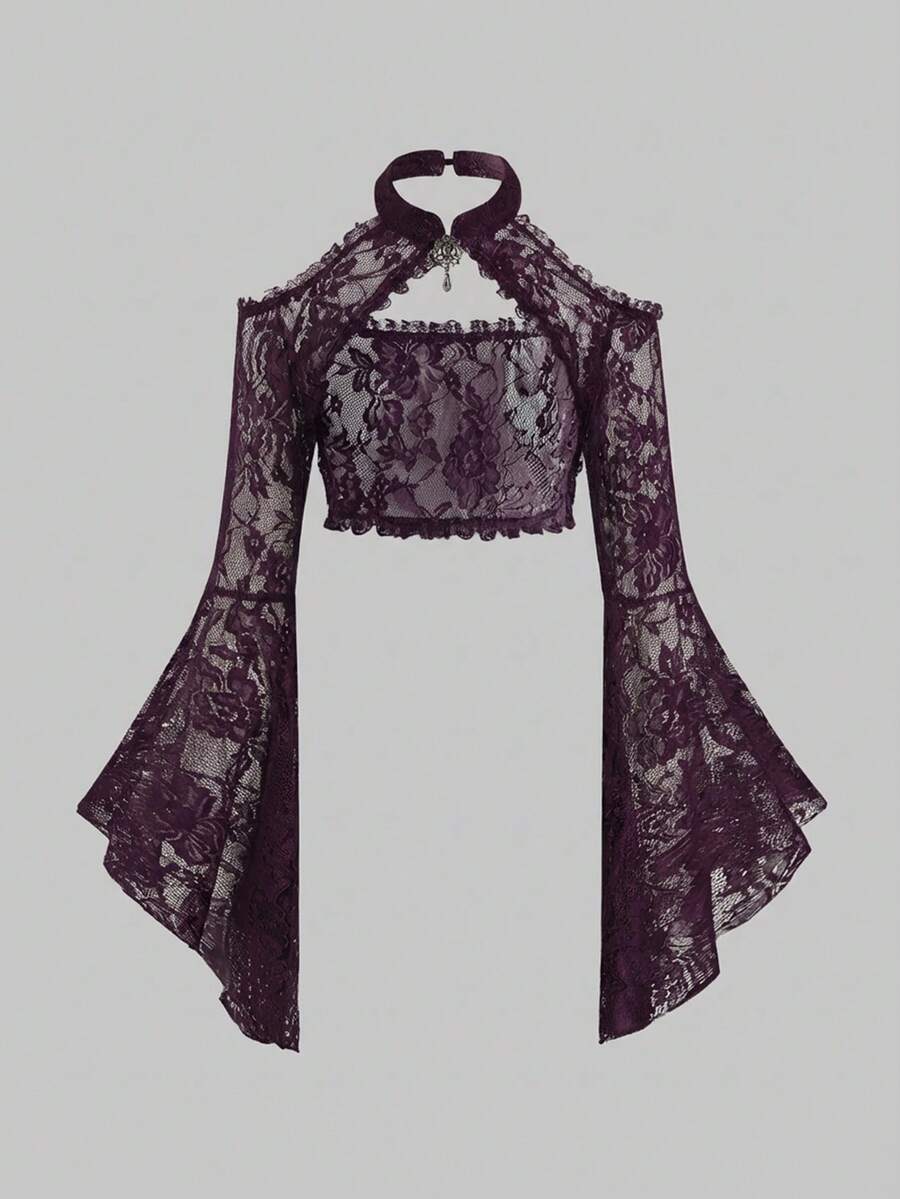 Gothic Palace Style Flare Sleeve Sheer Lace Cutout Cropped Halter Top