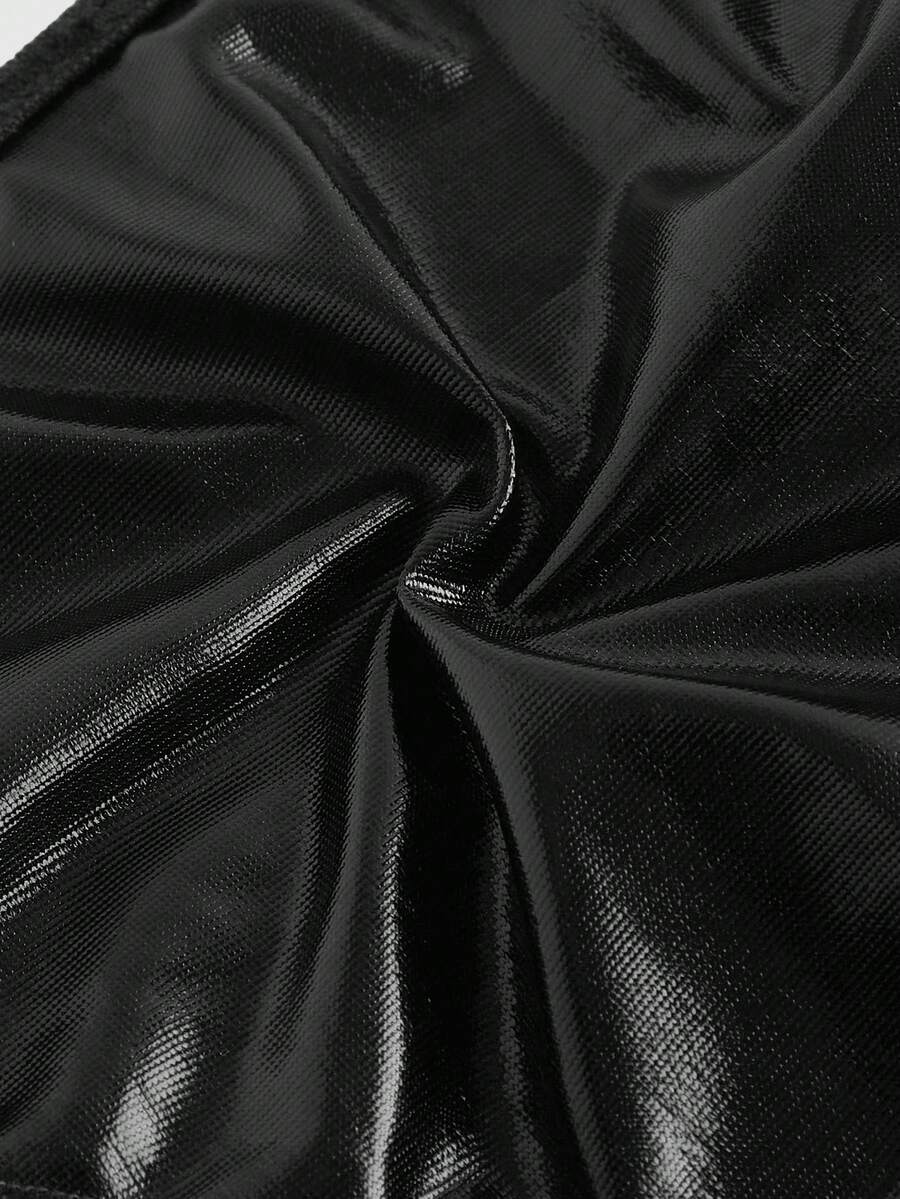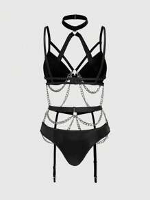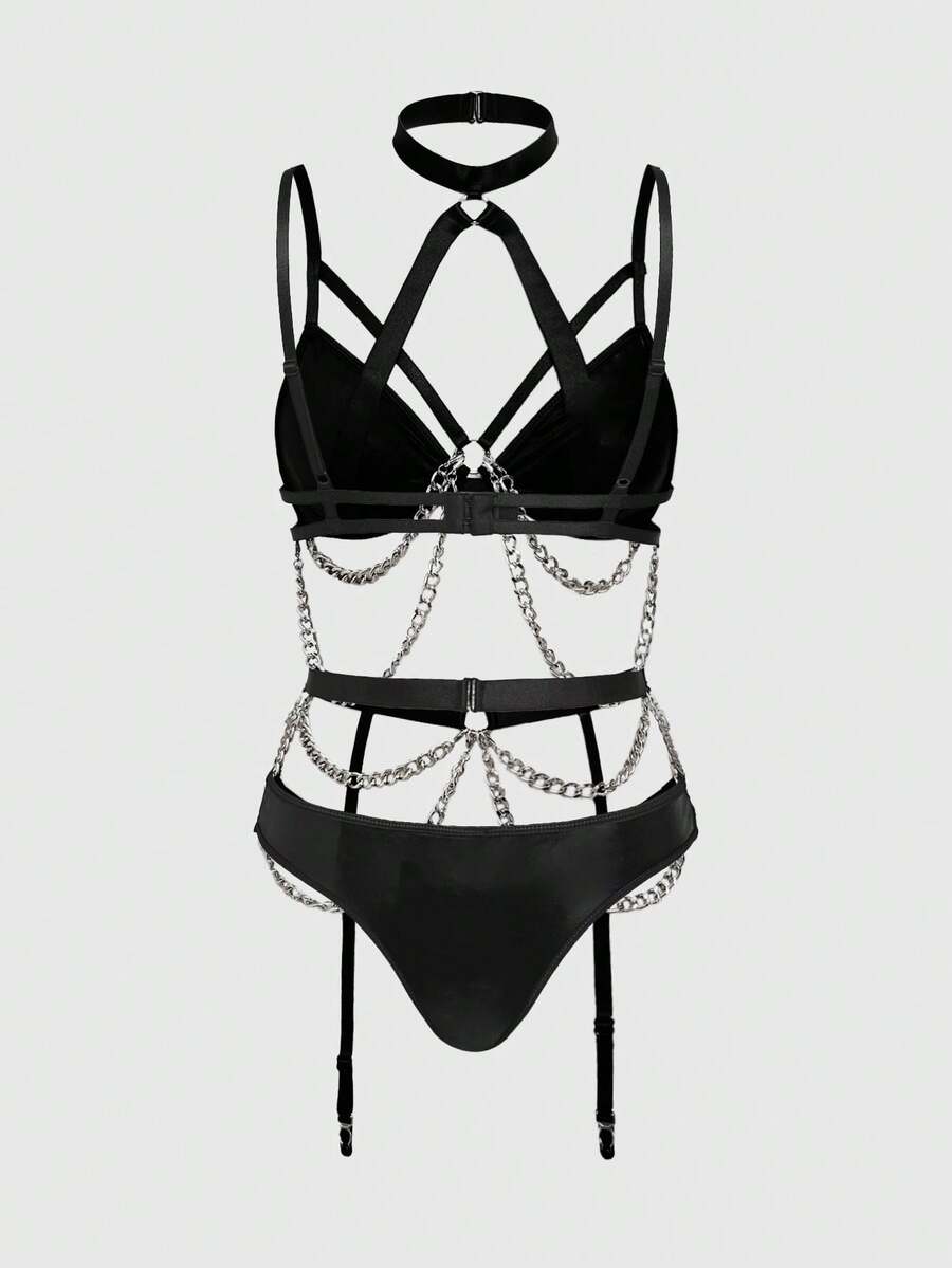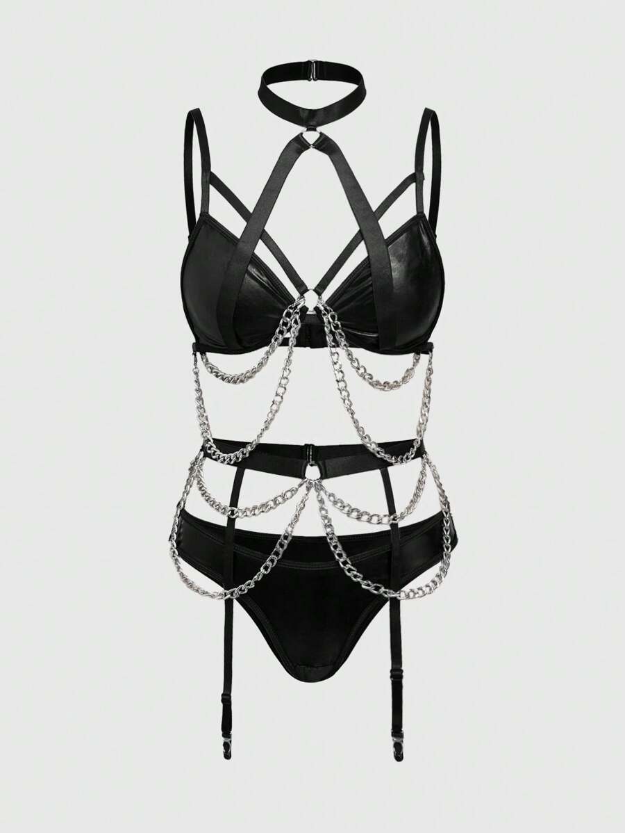 Gothic Punk Style Faux Leather Metal Chain Harness Bralette & Thong Lingerie Set