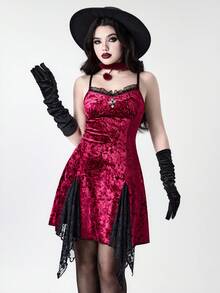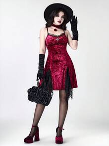 Goth Gothic Retro Palace Style Contrast Color Lace Trim Ankh Cross Symbol Pendant Women Velvet Camisole Dress