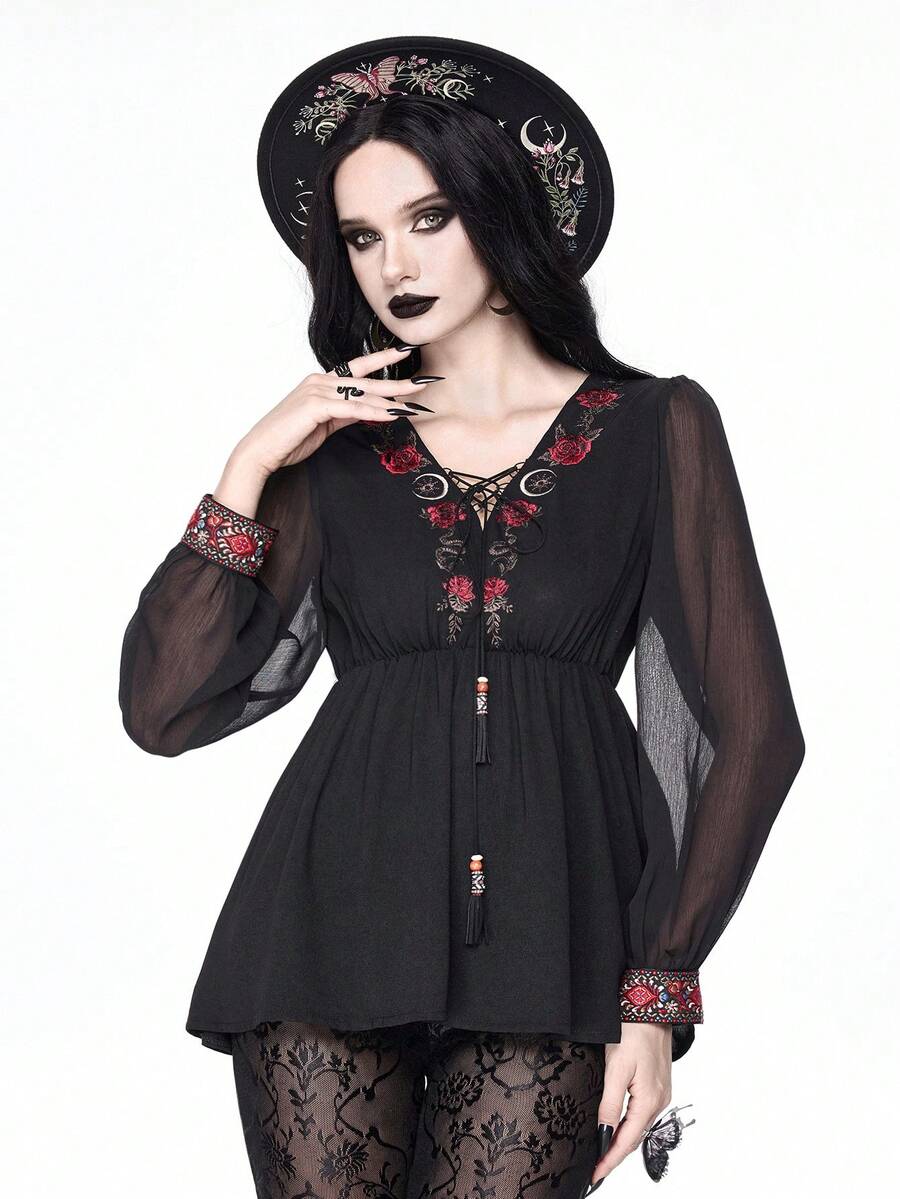 Goth Gothic Retro Rose Snake Skin Star Moon Embroidery Pattern A-Line Deep V-Neck Tie-Up Black Chiffon Puff Sleeve Fitted Women Top