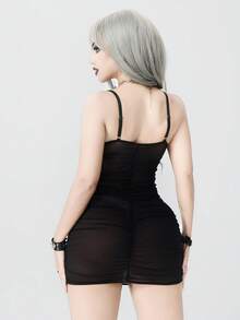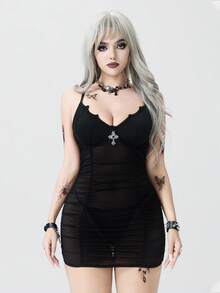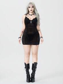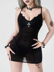 Gothic Sexy Bat & Cross Cutout Sheer Nightgown Set For Women, Halloween