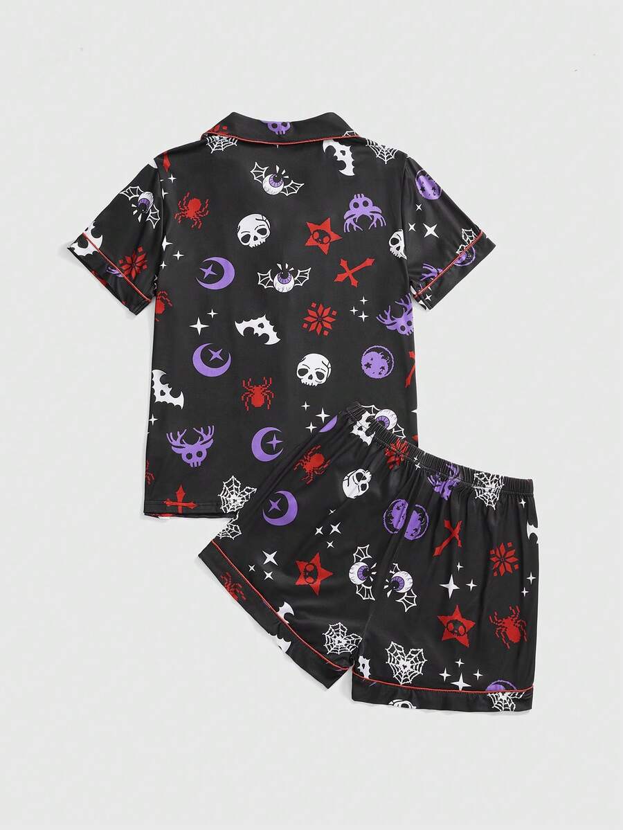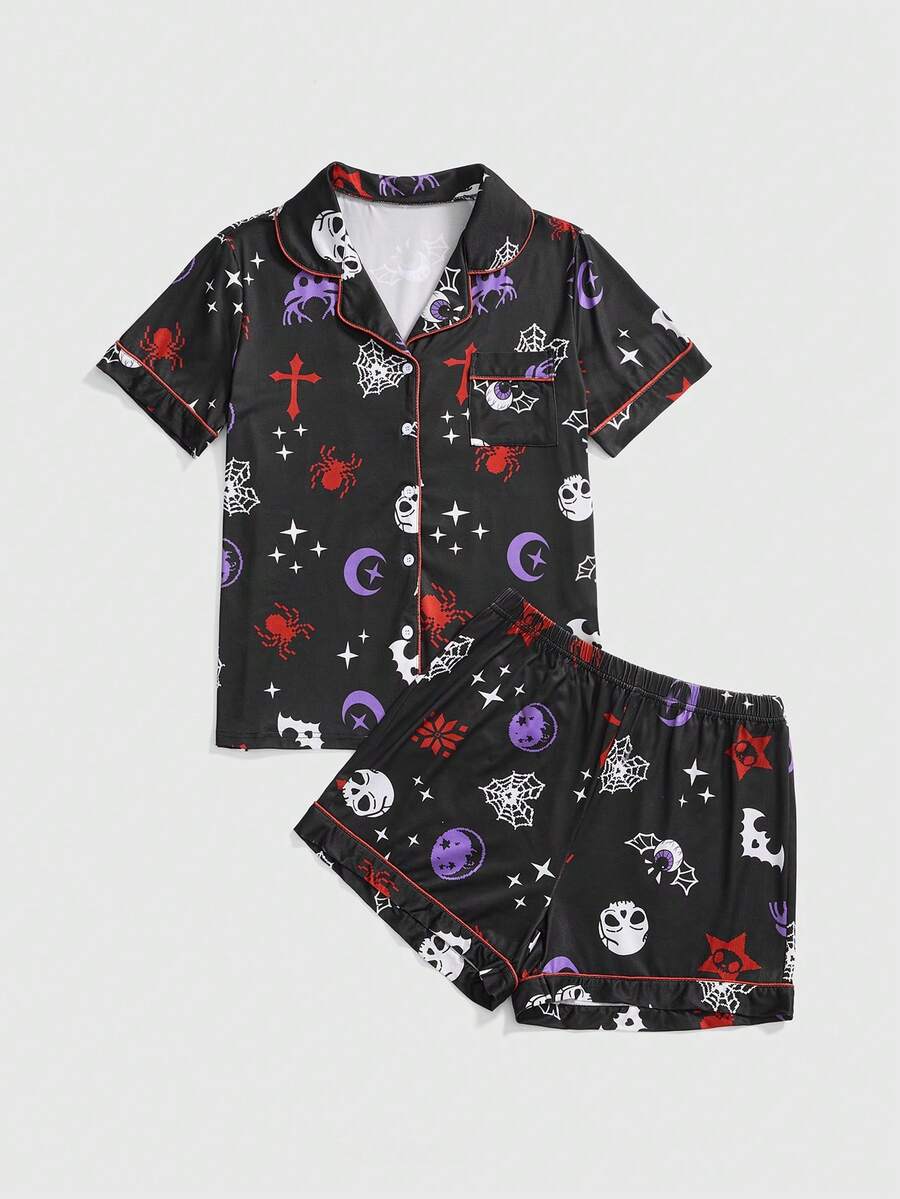Goth Gothic Skull, Cross, Deer Eye, Spider Web, Moon Full Print Short Sleeve & Shorts Pajama Set
