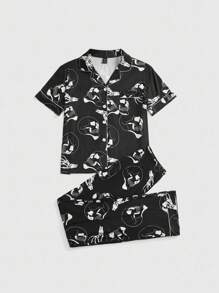 Gothic Skull Print Open Front Short Sleeve Knit Loungewear Set, Halloween