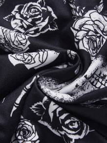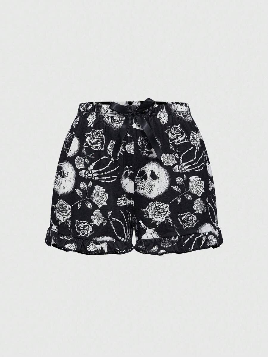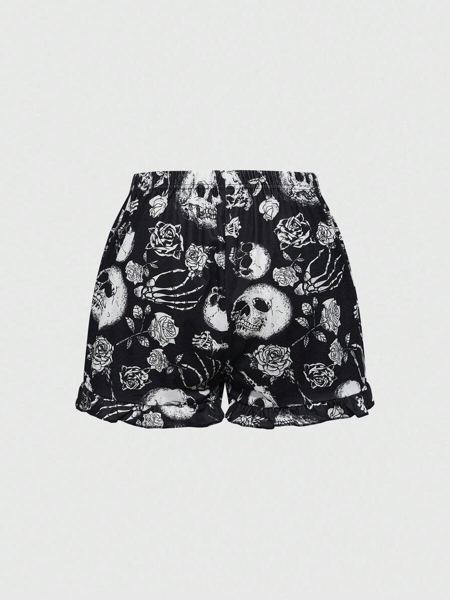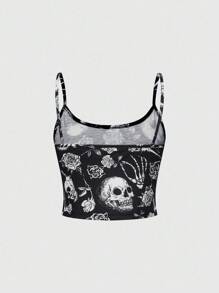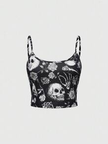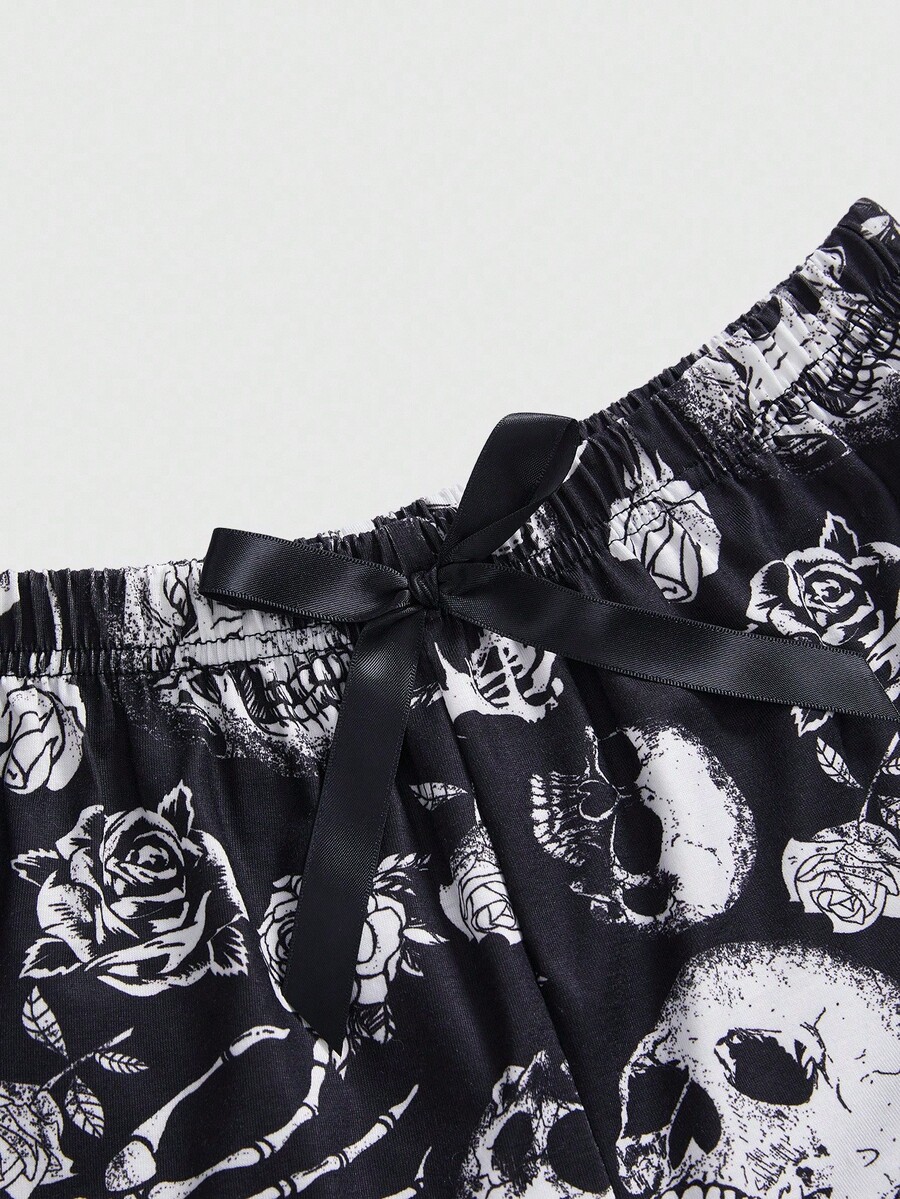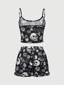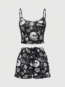 Gothic Skull & Rose Print Camisole & Shorts Pajama Set, Casual Sleepwear, Halloween
