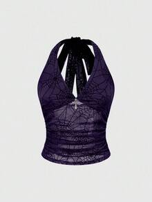 Gothic Spider Web Flocked Bodycon Halter Neck Tank Top For Women