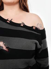 ROMWE Avant Gothic Style Distressed Striped Plus Size Crew Neck Sweater, Black & Grey Color, Suitable For Halloween