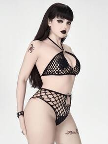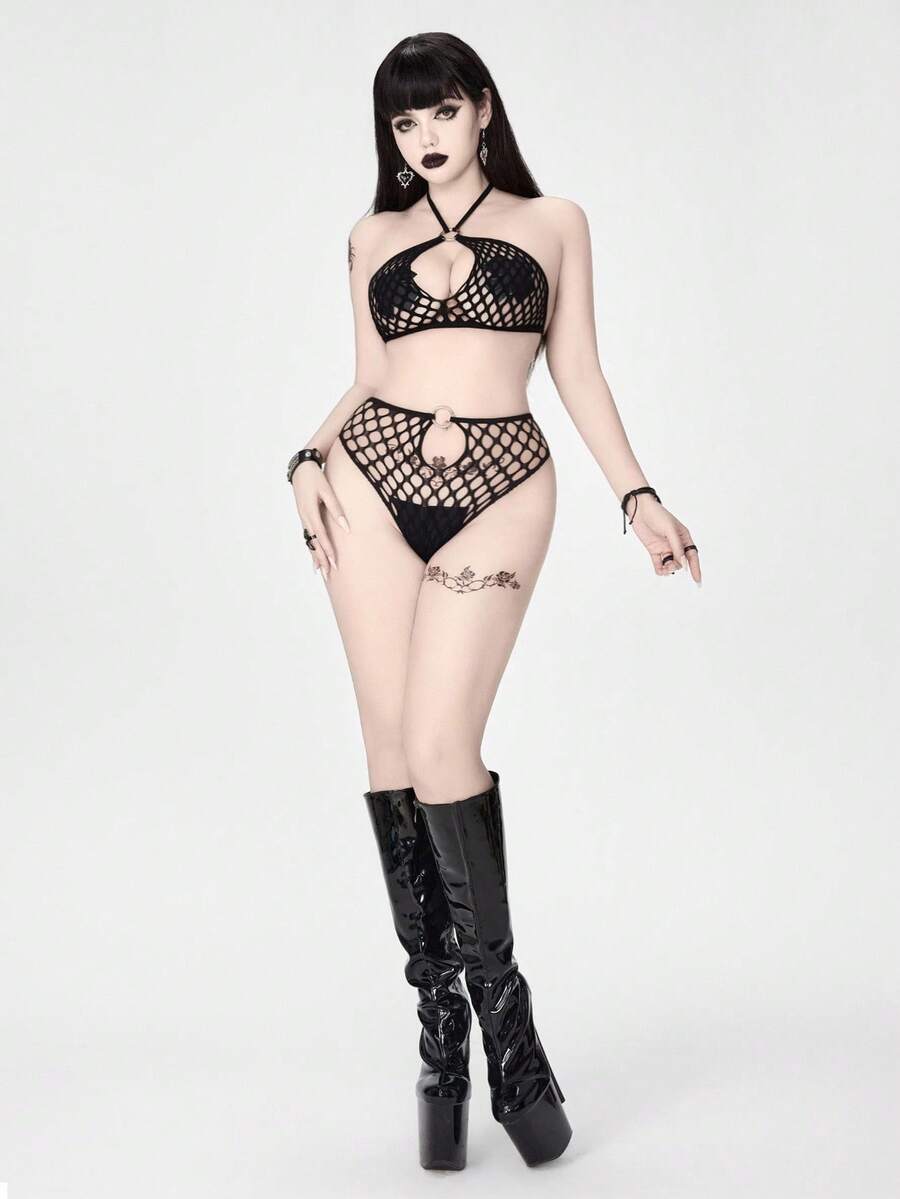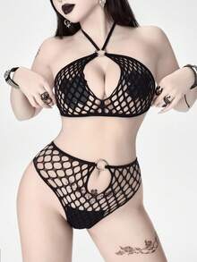 Gothic Style Elastic Mesh Metal Sexy Lingerie Set For Women