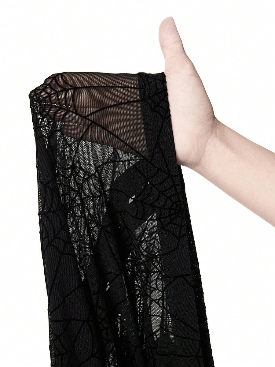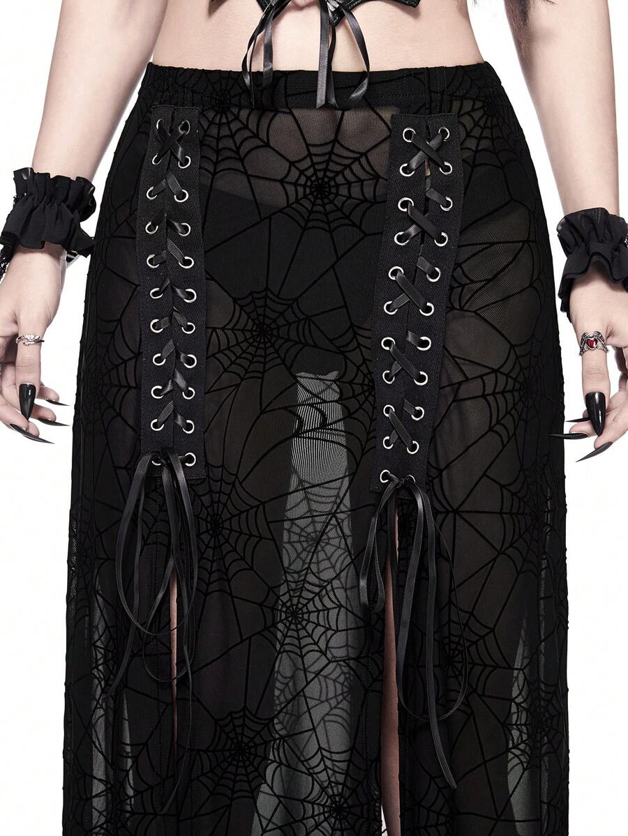 Gothic Style High Slit Spider Web Flocking Bodycon Pencil Skirt For Women, Halloween