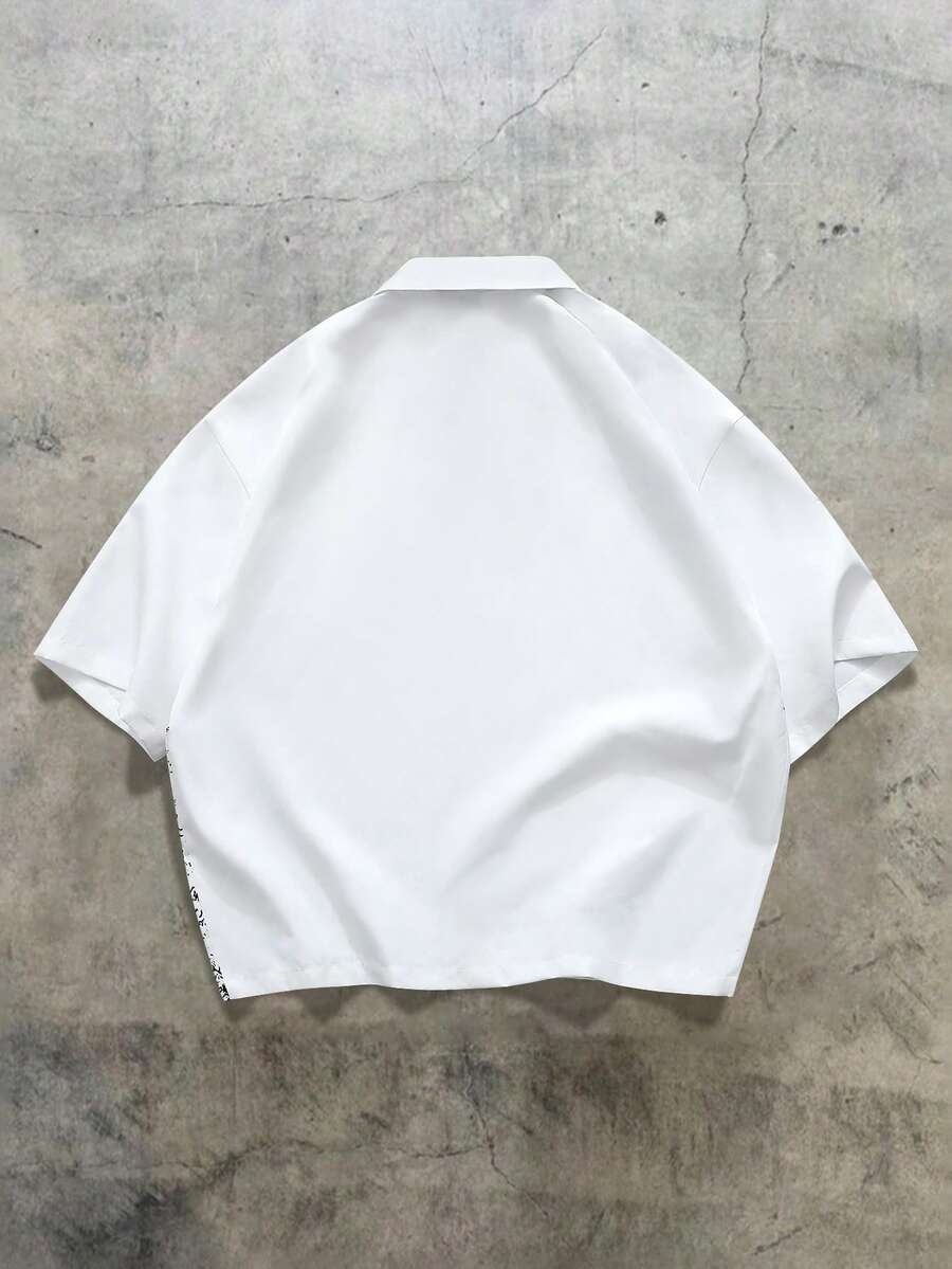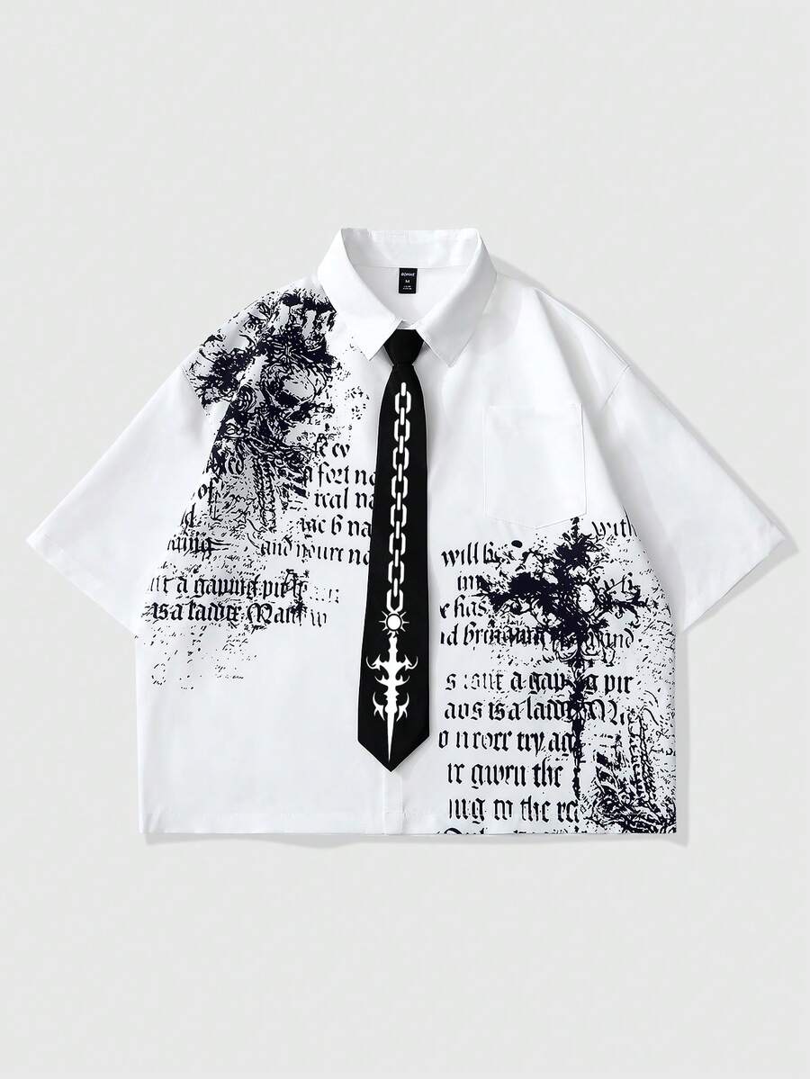 Gothic Style Print Short Sleeve Casual Shirt With Black Tie Design, Button-Up, Suitable For Daily Casual, College, And Street Style In Summer