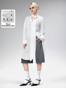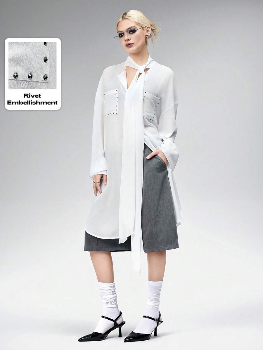 Gothic Style Rivet Decor Chiffon Blouse With Asymmetrical Hem And Puff Sleeves For Women