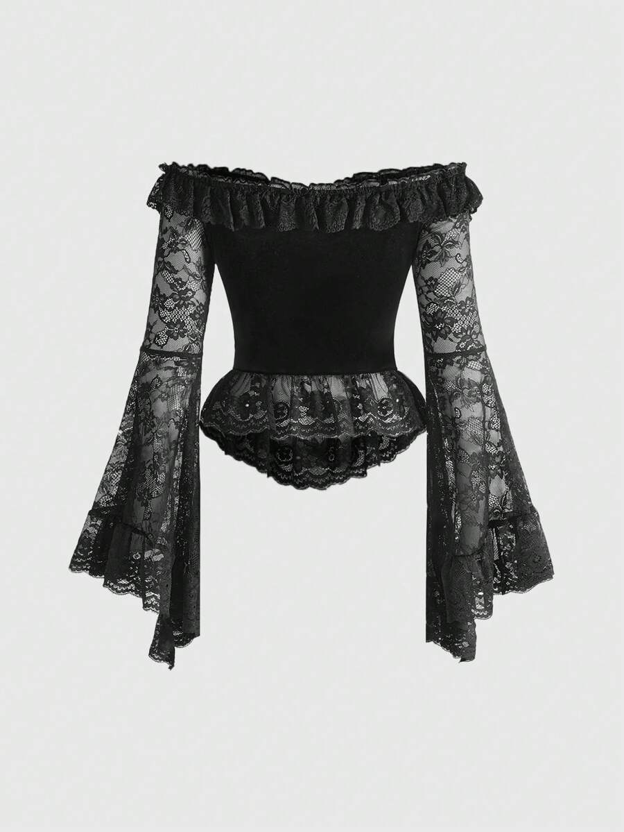 Goth Gothic Vintage Palace Style Off Shoulder Romantic Lace Patchwork Cross Embroidery Blouse
