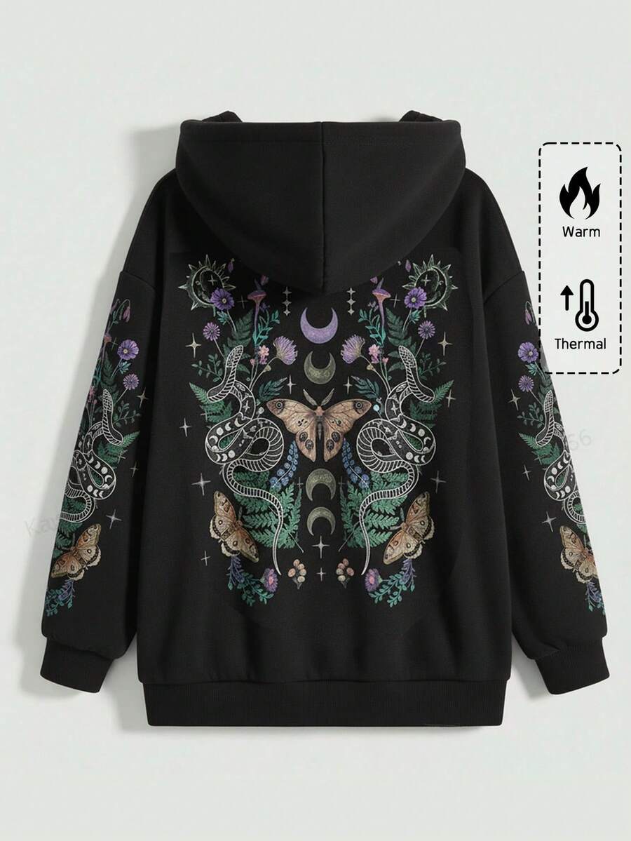 Gothic Y2K Bindweed, Butterfly, Coiled Snake, Thorn Tree Plus Size Black Zip-Up Hoodie Jacket, Autumn/Winter Plus Size Women's Black Hoodie Jacket, Christmas Holiday Casual Women's Hoodie Jacket