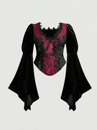 Goth Plus Size Women Elegant Vintage Color Block Jacquard Flare Sleeve Top