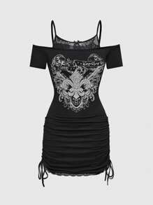 Graphic Tees Women Punk Print Lace Patchwork Ruffle Asymmetric Hem Women Dress