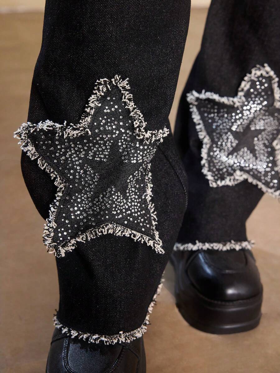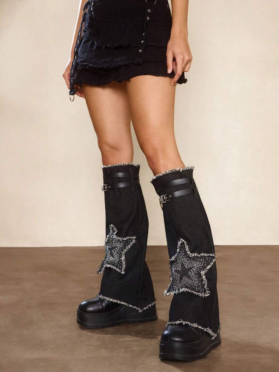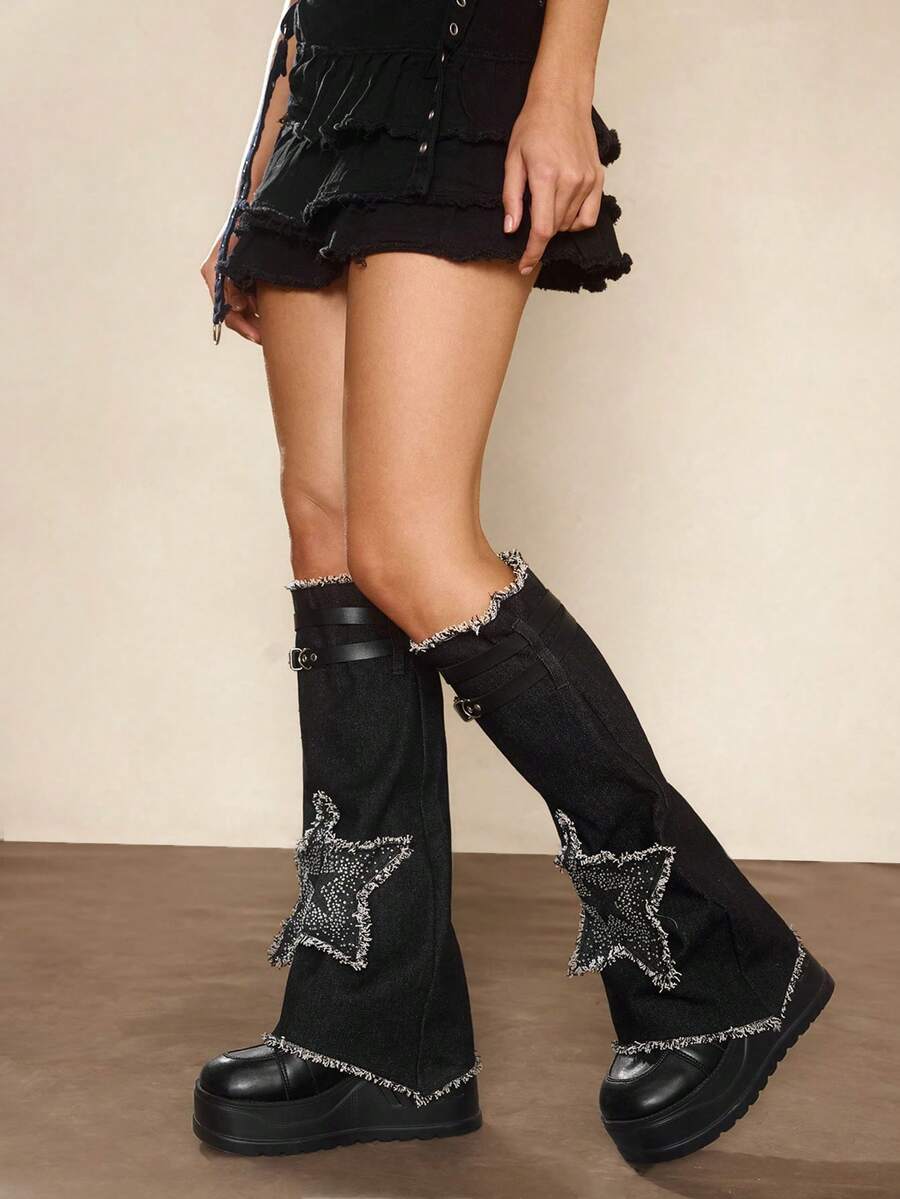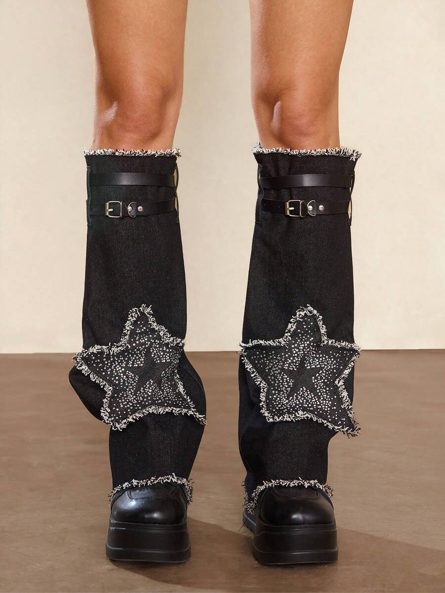 Grunge Punk 1 Pair Punk-Style Leather Strap Bell-Bottom Leg Warmers With Rhinestones Star Design, Unique Fringed Leg Warmers, Versatile Goth Fashion Accessories, Halloween