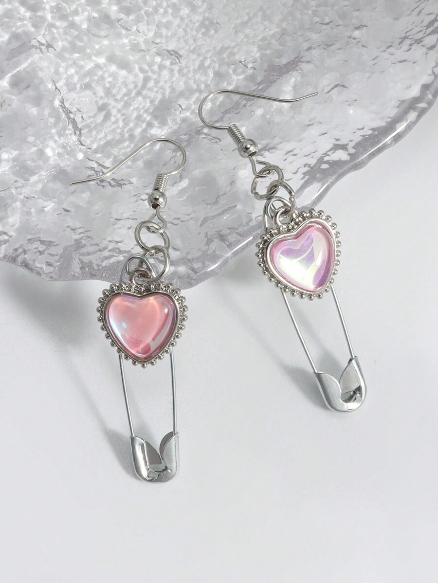 Grunge Punk 1 Pair Punk Style Silver Paperclip Colorful Heart Dangle Earrings For Women, Suitable For Holiday Gifts And Daily Wear