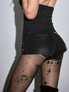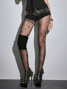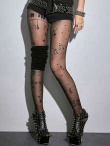 Grunge Punk 1 Pair Sexy Skeleton Print Tights, Y2K Minimalist Style Solid Black Pantyhose, Super Thin Elastic Sheer Leggings